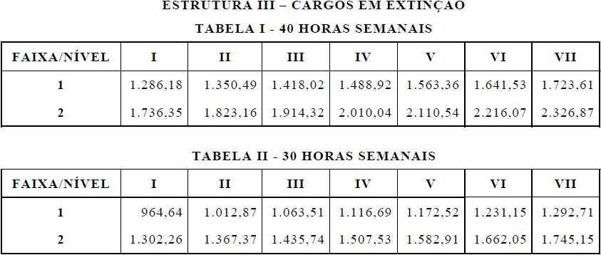 III - Estrutura III: constituída de 2 (duas) faixas e 7 (sete) níveis, aplicável às classes em extinção de Secretário de Escola e Assistente de Administração Escolar.