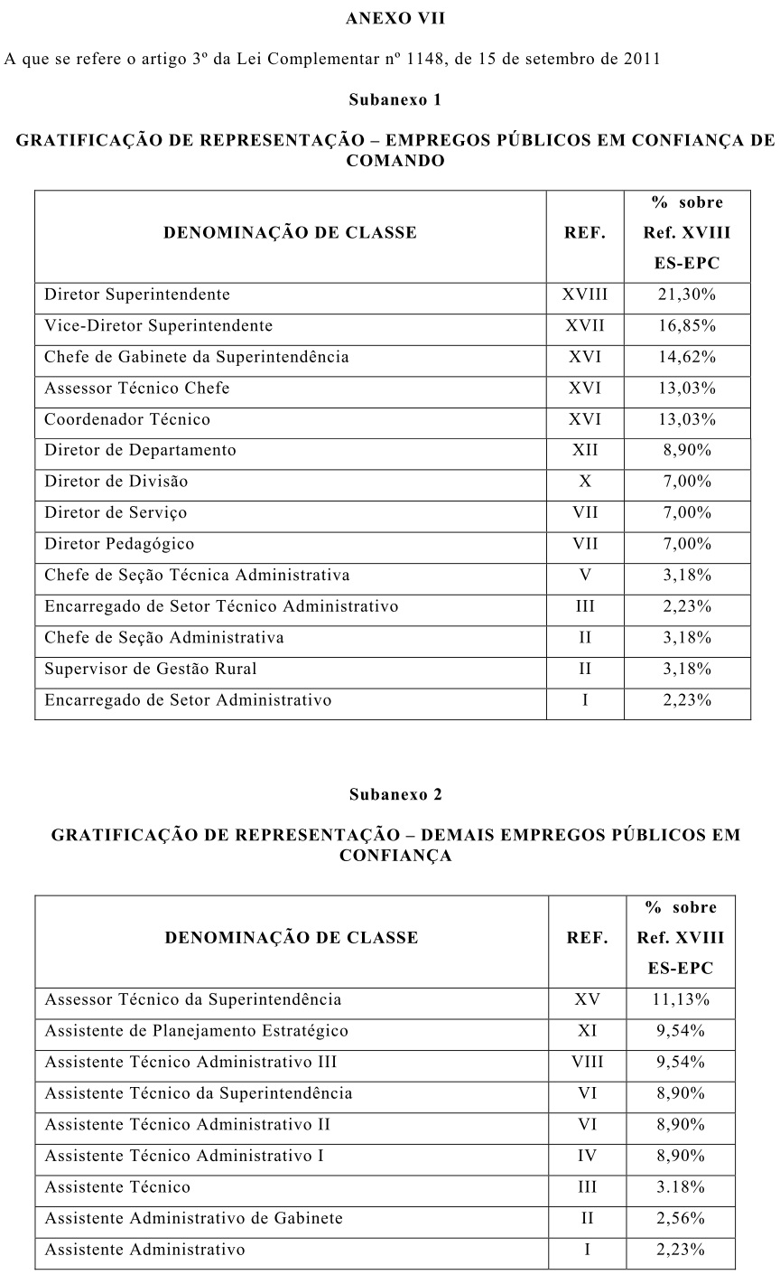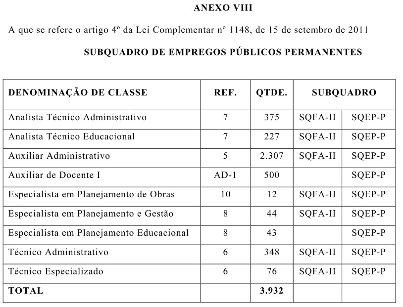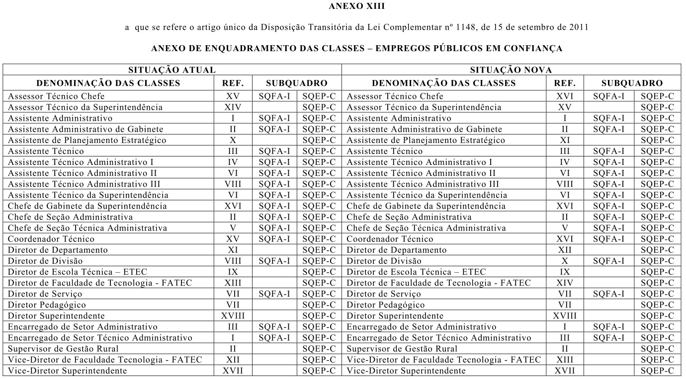- Os empregos públicos de provimento em comissão previstos no Anexo XIII da Lei Complementar nº 1.148, de 15/09/2011, foram declarados inconstitucionais pelo Tribunal de Justiça do Estado de São Paulo, na Ação Direta de Inconstitucionalidade nº 2218008-51.2016.8.26.0000, julgada em 22/03/2017, modulados os efeitos em 120 dias a partir de 22/03/2017.