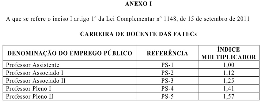 I - carreira de docente das Faculdades de Tecnologia - FATECs: os valores das horas prestadas serão calculados mediante aplicação dos índices multiplicadores correspondentes a cada uma das classes sobre o valor por hora prestada fixado para a referência PS-1, nos termos do Anexo I desta lei complementar;