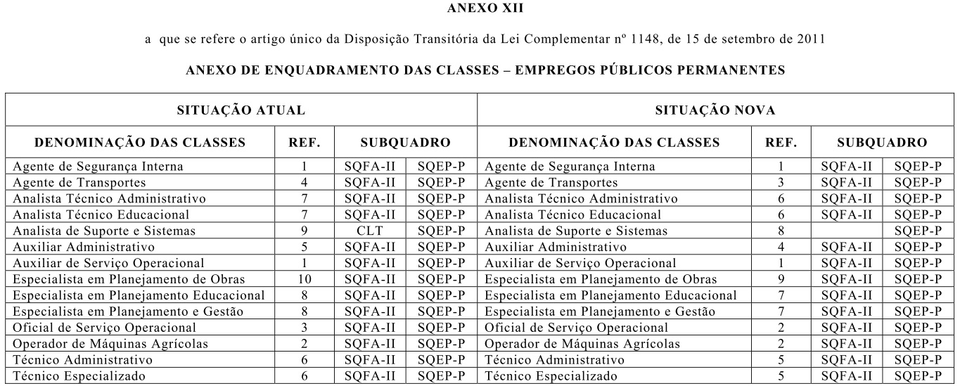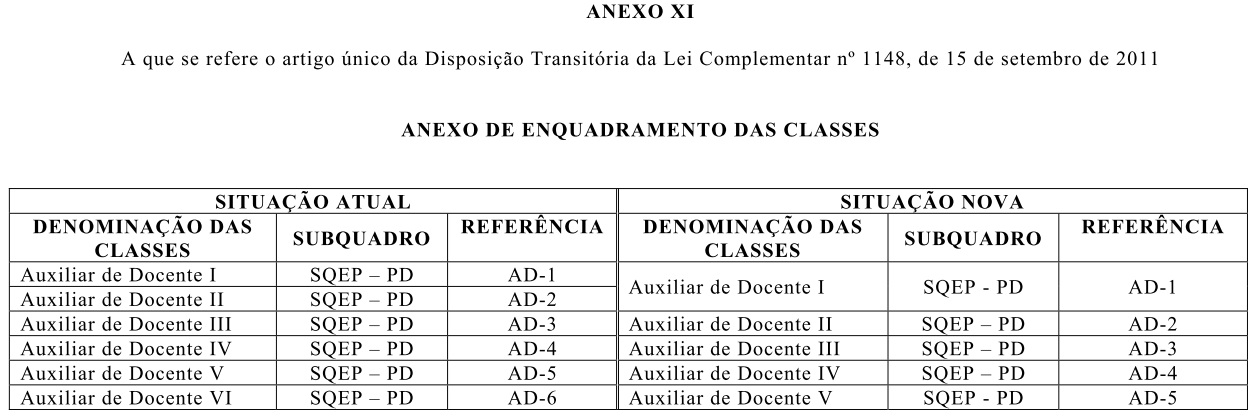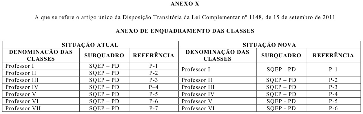 Artigo único - As classes constantes dos Anexos IX, X, XI, XII e XIII desta lei complementar ficam enquadradas, a partir de 1º de julho de 2011, na forma neles prevista.