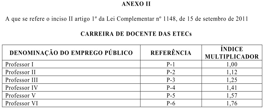“Artigo 7º - A carreira de docente das Escolas Técnicas - ETECs é composta por 6 (seis) classes de Professor, identificadas pelos algarismos romanos I, II, III, IV, V e VI, escalonadas de acordo com as exigências de maior capacitação para o magistério do ensino médio e de educação profissional técnica de nível médio.” (NR);