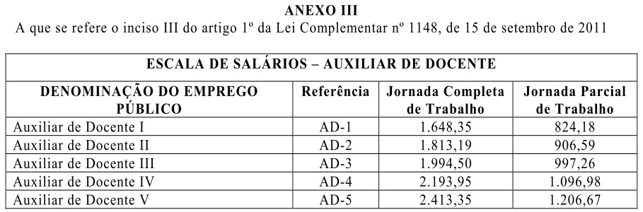 III - carreira de Auxiliar de Docente, Escala de Salários - Auxiliar de Docente, constituída de 5 (cinco) referências, identificadas pelas siglas AD-1 a AD-5, nos termos do Anexo III desta lei complementar;