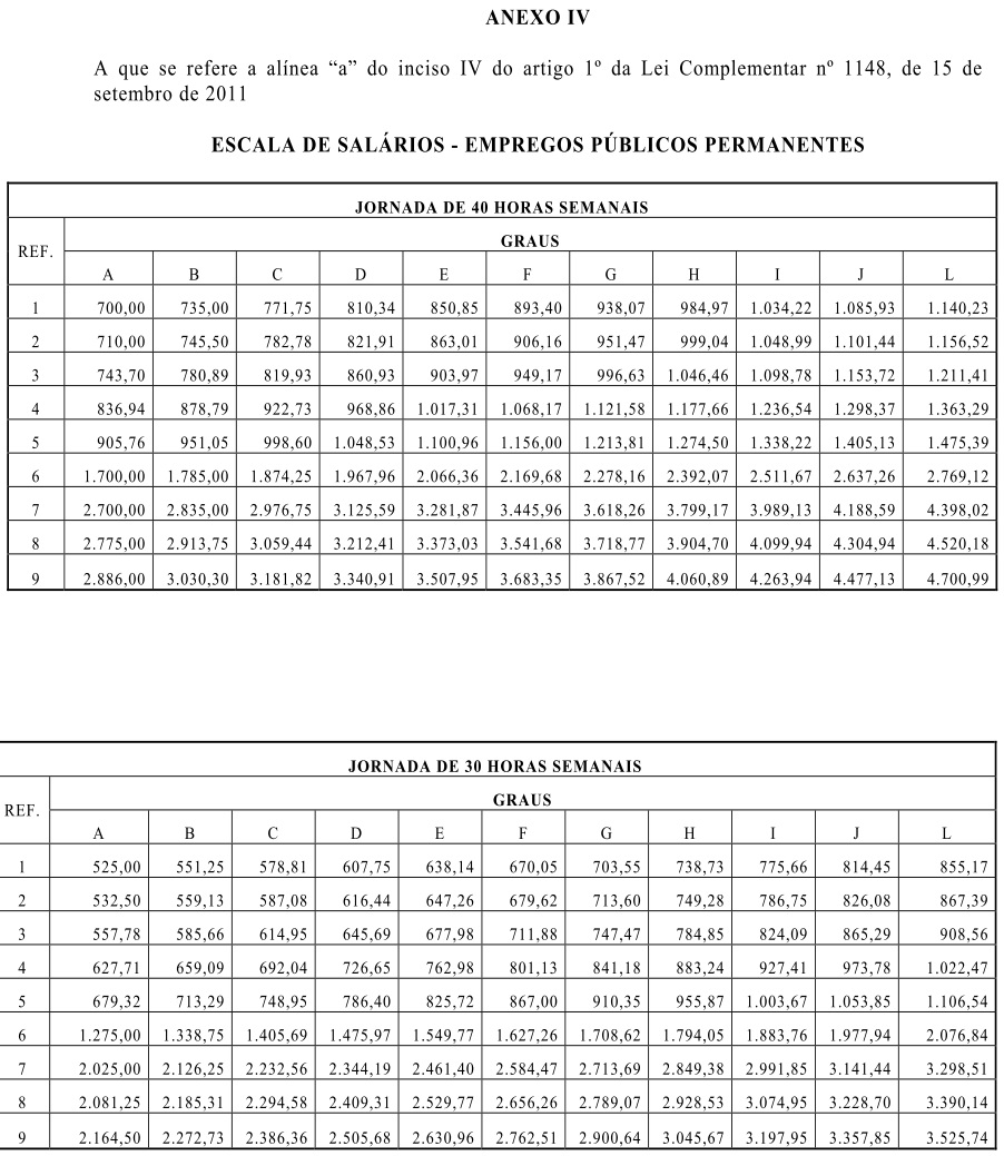 a) Escala de Salários - Empregos Públicos Permanentes, constituída de 9 (nove) referências, identificadas por algarismos arábicos de 1 (um) a 9 (nove) e por 11 (onze) graus, representados pelas letras “A” a “L”, nos termos do Anexo IV desta lei complementar;