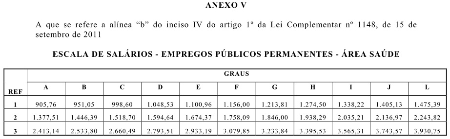 b) Escala de Salários - Empregos Públicos Permanentes - Área Saúde, constituída de 3 (três) referências, identificadas por algarismos arábicos de 1 (um) a 3 (três) e por 11 (onze) graus, representados pelas letras “A” a “L”, nos termos do Anexo V desta lei complementar;