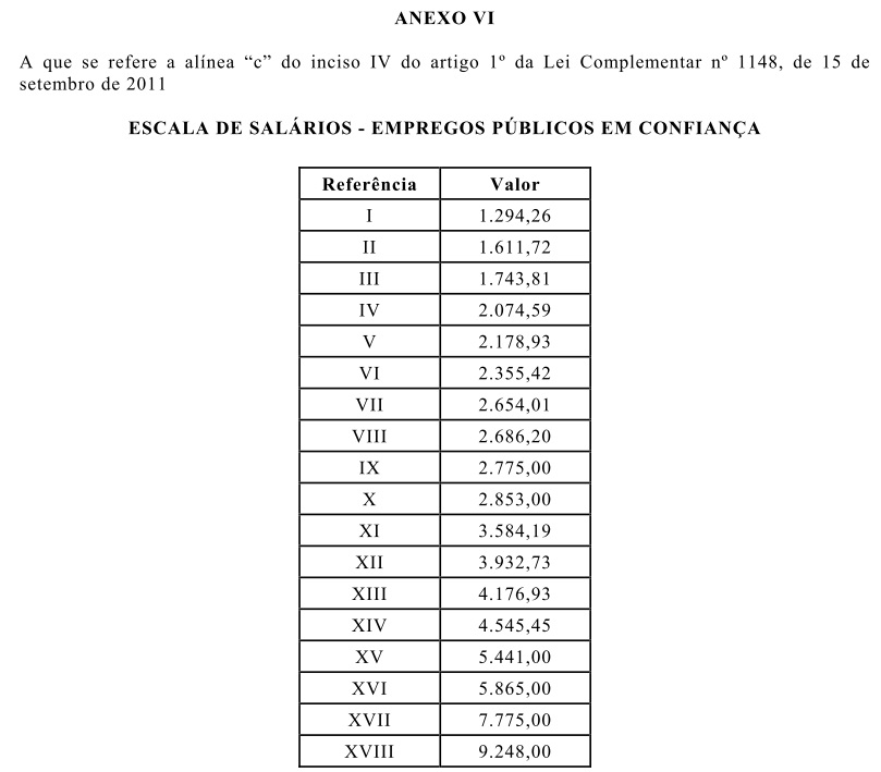 c) Escala de Salários - Empregos Públicos em Confiança, constituída de 18 (dezoito) referências, representadas por algarismos romanos de I a XVIII, nos termos do Anexo VI desta lei complementar.