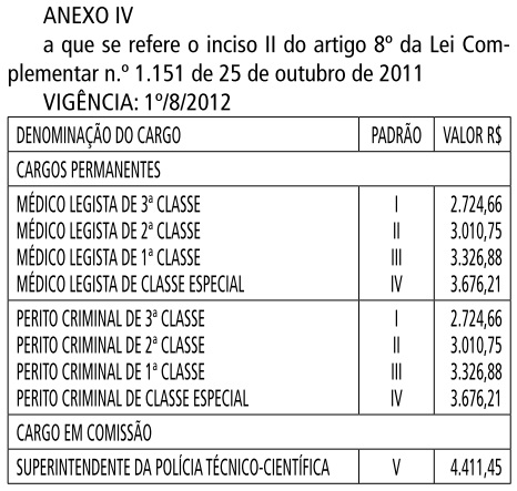 a) R$ 1.575,00 (mil, quinhentos e setenta e cinco reais), para o Delegado Geral de Polícia, Superintendente da Polícia Técnico-Científica e para as carreiras de Delegado de Polícia, Médico Legista e Perito Criminal;" (NR);
