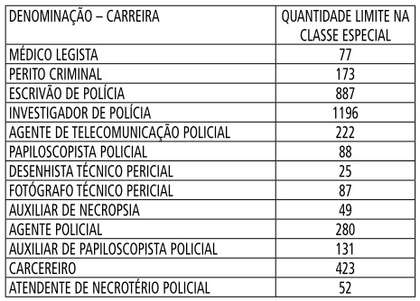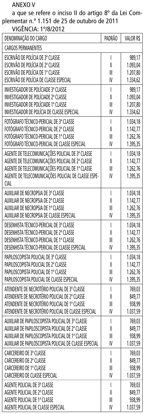 II - Anexos IV e V desta lei complementar, a partir de 1° de agosto de 2012.Artigo 9° - A evolução funcional dos integrantes das carreiras policiais civis dar-se-á por meio de promoção, que consiste na elevação à classe imediatamente superior da respectiva carreira.Artigo 10 - A promoção será processada pelo Conselho da Polícia Civil, adotados os critérios de antiguidade e merecimento, realizando-se, no mínimo, uma promoção por semestre.§ 1° - A evolução funcional até a 1ª Classe das carreiras de policiais civis dar-se-á por quaisquer dos critérios estabelecidos neste artigo, e para a Classe Especial, somente por merecimento.§ 2° - O processo de promoção a que se refere o "caput" deste artigo instaura-se mediante Portaria do Presidente do Conselho da Polícia Civil.Artigo 11 - A promoção de que trata o artigo 10 desta lei complementar será processada na seguinte conformidade:I - alternadamente, em proporções iguais, por antiguidade e por merecimento, da 3ª até a 1ª Classe, limitado o quantitativo de promoções ao número correspondente de vacâncias ocorridas em cada uma das classes das respectivas carreiras, no período que antecede a abertura do respectivo processo;II - somente por merecimento, para a Classe Especial, limitado o quantitativo de promoções a um número que não ultrapasse o contingente estabelecido no Anexo VI desta lei complementar, em atividade, na referida classe das respectivas carreiras.§ 1° - O quantitativo de promoções a que se refere o inciso I deste artigo poderá ser acrescido em número correspondente ao de promoções ocorridas dentro do próprio processo, inclusive aquelas ocorridas nos termos do artigo 22 desta lei complementar.§ 2° - Poderá concorrer à promoção o policial civil que, no período que anteceder a abertura do processo de promoção:1 - esteja em efetivo exercício na Secretaria da Segurança Pública ou regularmente afastado para exercer cargo ou função de interesse estritamente policial;2 - tenha cumprido o interstício a que se refere o artigo 12 desta lei complementar.§ 3° - A promoção de que trata o "caput" deste artigo produzirá efeitos a partir da data da publicação do ato a que se refere o artigo 23 desta lei complementar.Artigo 12 - Poderá participar do processo de promoção, de que trata o artigo 10 desta lei complementar, o policial civil que tenha cumprido o interstício mínimo de:I - 4 (quatro) anos de efetivo exercício na 3ª Classe;II - 4 (quatro) anos de efetivo exercício na 2ª e na 1ª Classe.