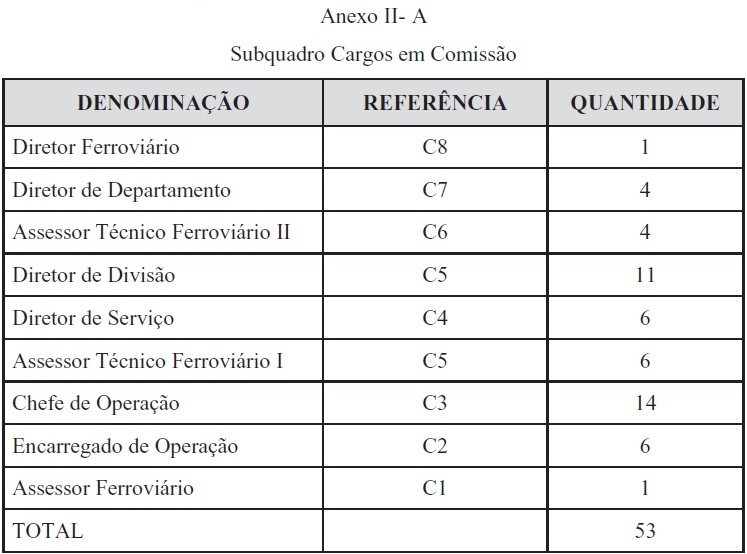 II - no Subquadro de Empregos Públicos em Confiança (SQEP-C):a) Assistente Ferroviário;b) Assistente Técnico Ferroviário I;c) Assistente Técnico Ferroviário II;d) Diretor de Departamento;e) Diretor de Divisão;f) Chefe de Operação;g) Encarregado de Serviço.
