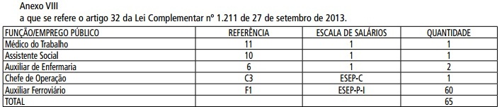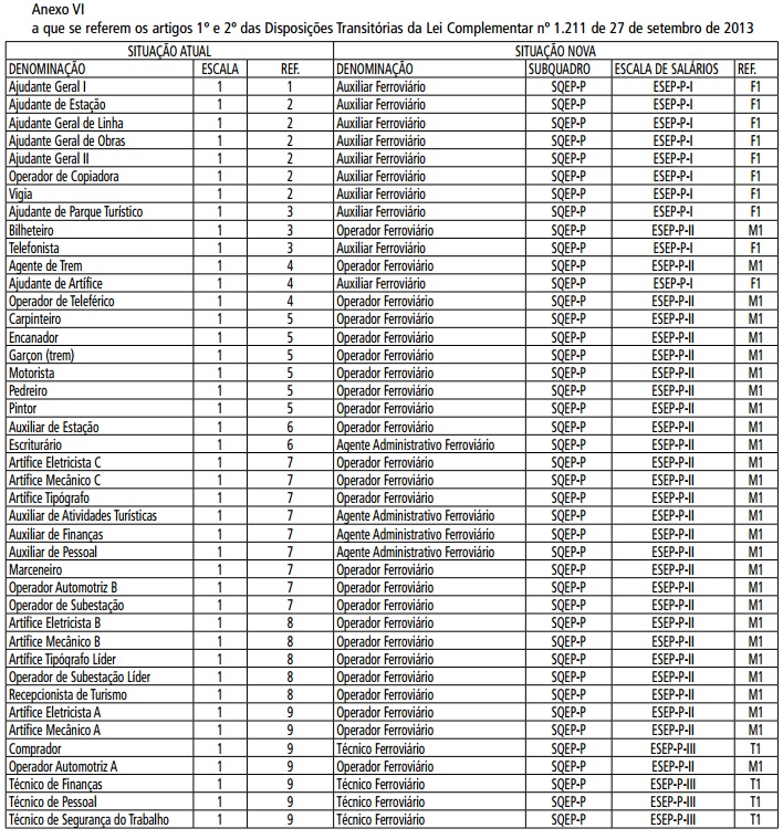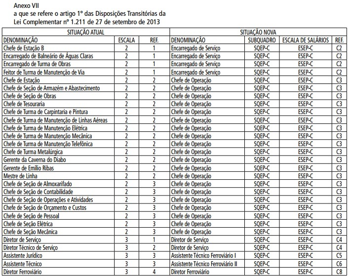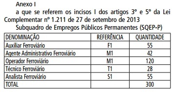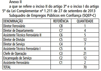 d) 55 (cinquenta e cinco) de Analista Ferroviário I, Padrão "S1-A";II - no Subquadro de Empregos Públicos em Confiança (SQEP-C), a que se refere o inciso II do artigo 3° desta lei complementar, enquadrados na Escala de Salários - Empregos Públicos em Confiança:a) 2 (dois) de Assistente Ferroviário, Referência C1;b) 5 (cinco) de Assistente Técnico Ferroviário I, Referência C5;c) 1 (um) de Diretor de Serviço, Referência C4;d) 12 (doze) de Diretor de Divisão, Referência C5;e) 3 (três) de Assistente Técnico Ferroviário II, Referência C6;f) 4 (quatro) de Diretor de Departamento, Referência C7.
