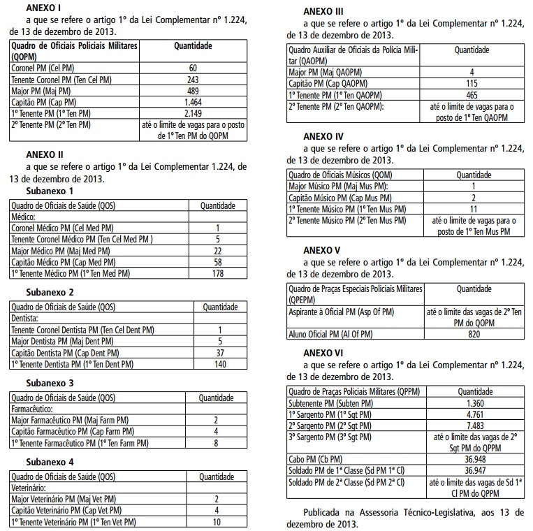 Artigo 1º - O efetivo da Polícia Militar fica fixado na conformidade dos Anexos I a VI que integram esta lei complementar.