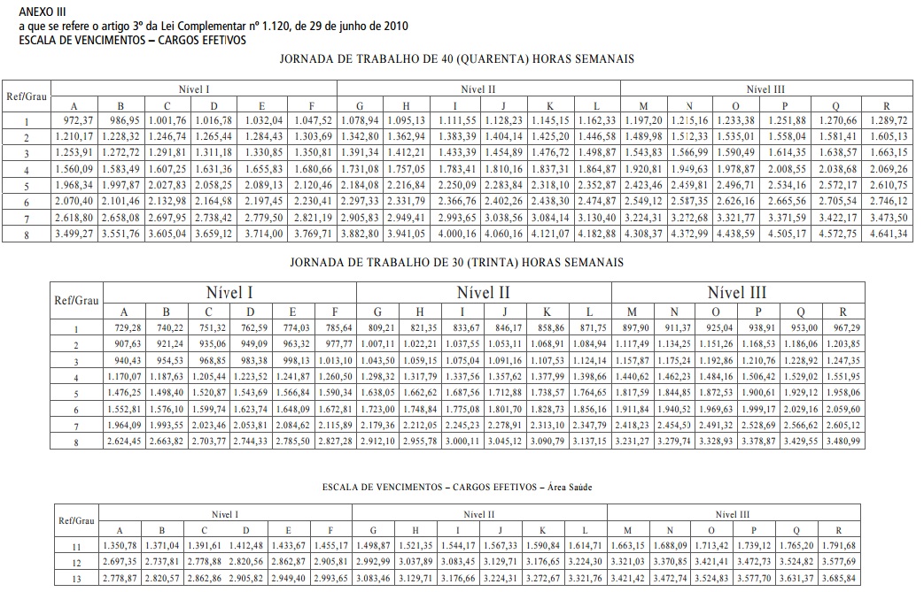 Artigo 4º - Os valores constantes dos Anexos III e IV da Lei Complementar nº 1.120, de 29 de junho de 2010, passam a vigorar reajustados de acordo com os percentuais aplicados sobre vencimentos entre 2010 e 2013, nos termos dos Anexos I e II desta lei complementar.