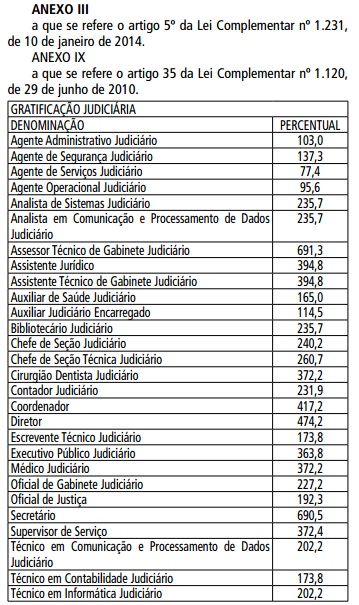Artigo 10 - Fica concedida aos servidores ocupantes do cargo de Agente Administrativo Judiciário em exercício nas unidades judiciais de primeiro e segundo graus, Gratificação pelo Desempenho de Atividades Cartorárias, correspondente a 65% (sessenta e cinco por cento) do Padrão 1-A da Escala de Vencimentos - Cargos Efetivos - Jornada de Trabalho de 40 (quarenta) horas semanais, constante do Anexo III da Lei Complementar nº 1.120, de 29 de junho de 2010.