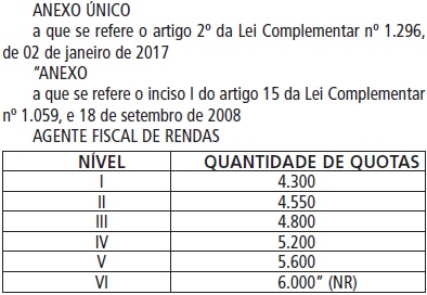 Artigo 2º - O Agente Fiscal de Rendas que em 1º de agosto de 2016 contasse com 3 (três) anos ou mais de efetivo exercício no cargo e se encontrasse enquadrado no Nível I, em decorrência do disposto no parágrafo único do artigo 3º da Lei Complementar nº 1.059, de 18 de setembro de 2008, com a redação dada pelo inciso I do artigo 1º desta lei complementar, terá o cargo enquadrado no Nível II, a partir de 1º de agosto de 2016.