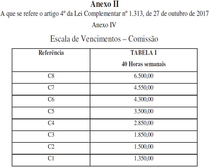 II - na Escala de Vencimentos - Comissão - constituída por 8 (oito) referências alfanuméricas, em conformidade com o Anexo IV desta lei complementar.” (NR);