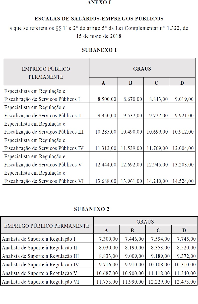 | Especialista em Regulação e Fiscalização de Serviços Públicos V | 17.671,69 | 18.025,12 | 18.385,62 | 18.753,34 |