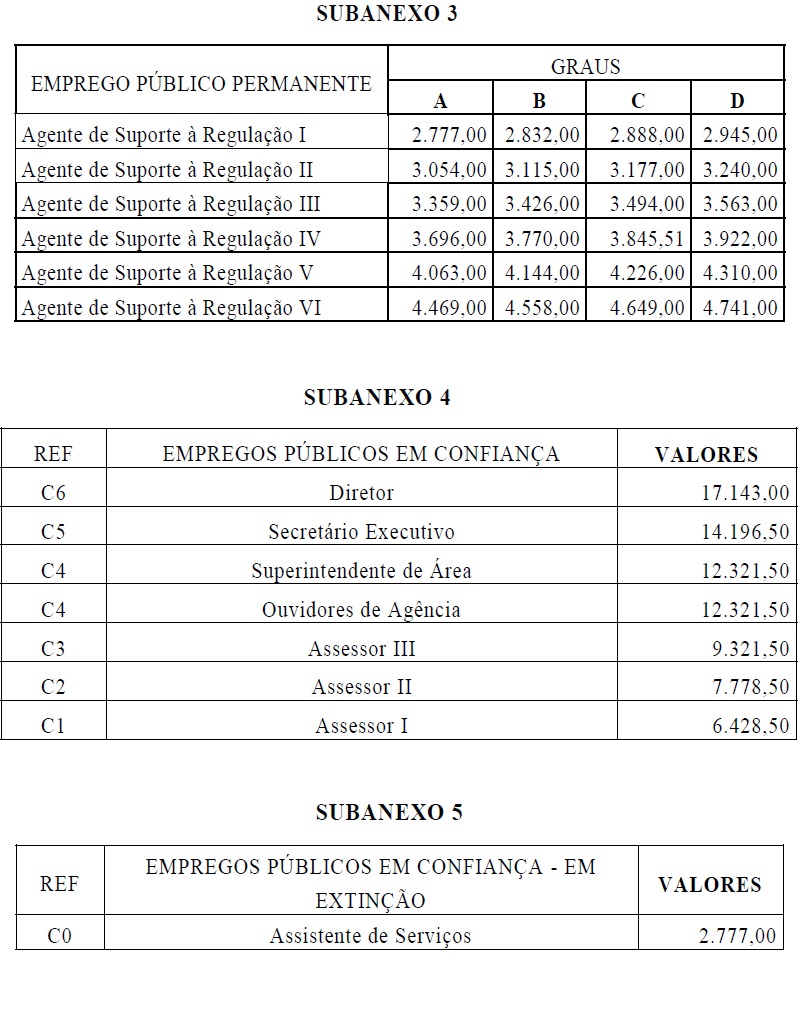 | Especialista em Regulação e Fiscalização de Serviços Públicos III | 14.604,70 | 14.896,79 | 15.194,73 | 15.498,62 |