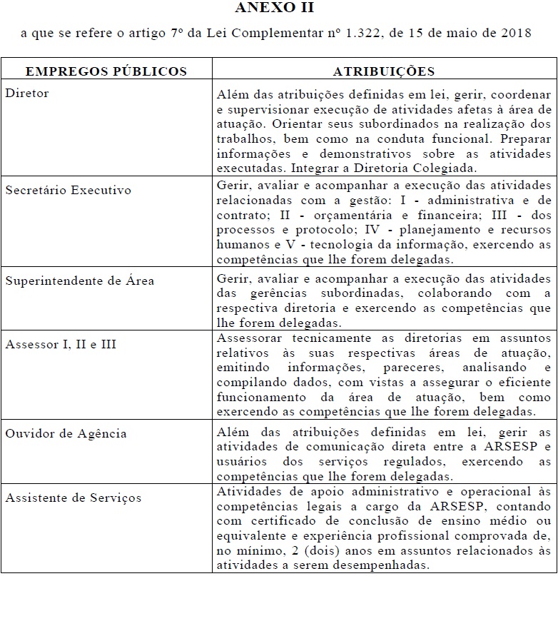 Artigo 7° - As atribuições sumárias dos empregos públicos em confiança, previstas nas alíneas "a" a "h" do inciso II do artigo 5° desta lei complementar, são as estipuladas no Anexo II desta lei complementar, sendo que o rol completo de atribuições, de acordo com as diversas áreas de atividades, será objeto de norma interna da ARSESP.