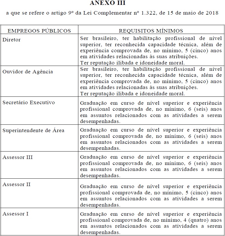 Artigo 9° - Os requisitos mínimos para preenchimento dos empregos públicos de que tratam as alíneas "a" a "g" do inciso II do artigo 5° desta lei complementar ficam estabelecidos no Anexo III desta lei complementar.