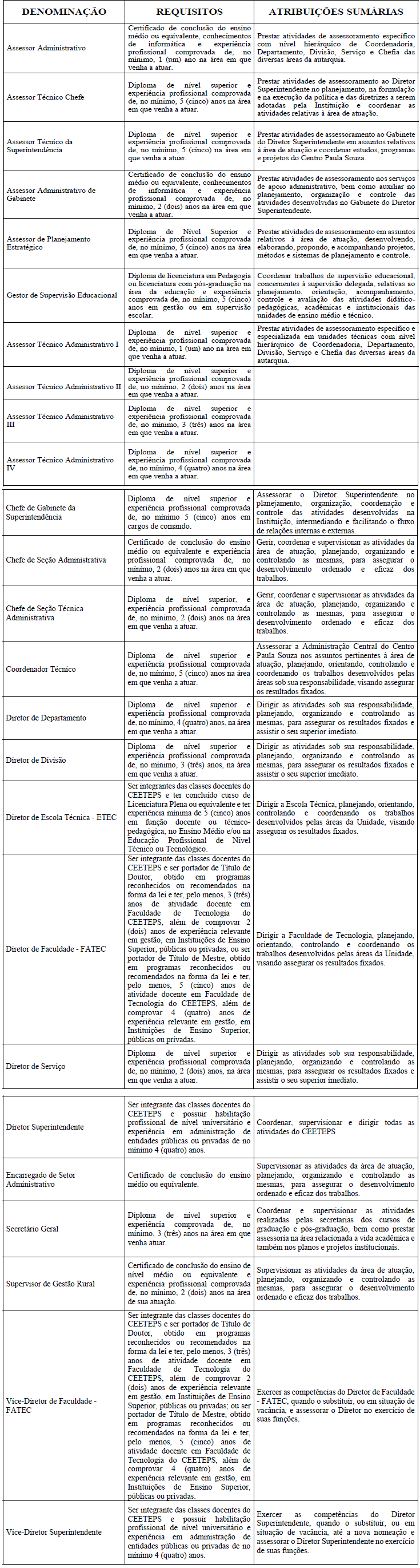 § 3º - O servidor indicado para exercer os empregos públicos em confiança de Diretor Superintendente, Vice-Diretor Superintendente, Diretor de Faculdade de Tecnologia - FATEC, Vice-Diretor de Faculdade de Tecnologia - FATEC e de Diretor de Escola Técnica - ETEC, privativos dos integrantes das classes docentes do CEETEPS, não poderá ter sofrido penalidade administrativa nos últimos 4 (quatro) anos.” (NR)