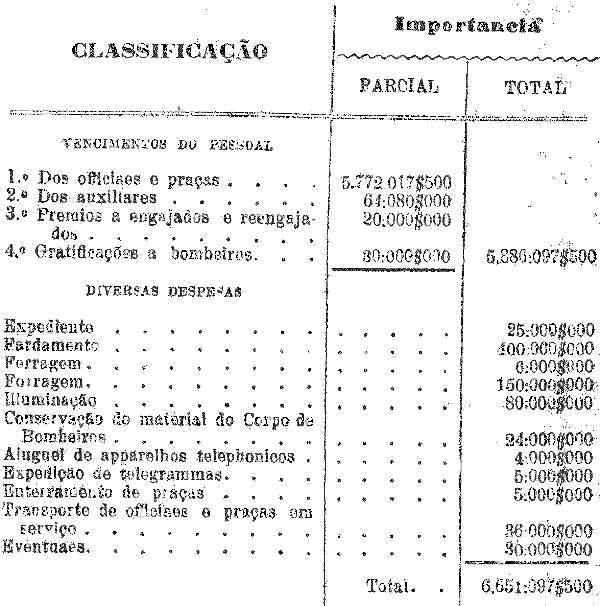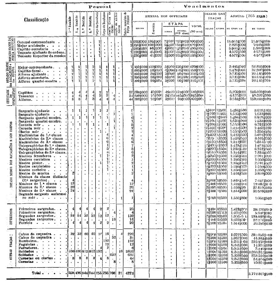 Artigo 1.º - A Força Policial do Estado, para o anno de 1904, compor-se á de quatro mil duzentos o vinte o um (4.221) homens, distribuidos em quatro Batalhões de infantaria um Corpo de Cavallaria, um Corpo de Bombeiros, a Guarda Civica da Capital, uma secção de enfermeiros e os auxiliares.