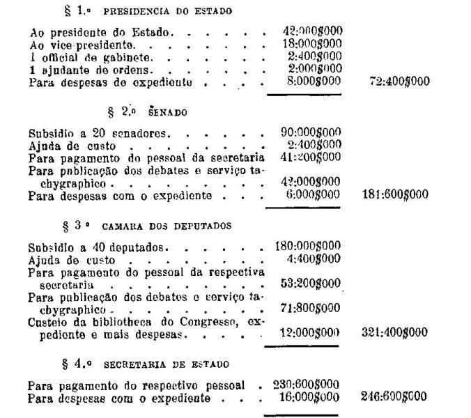 - Senado e Camara dos Deputados: Director, 7:000$000; bibliothecario,