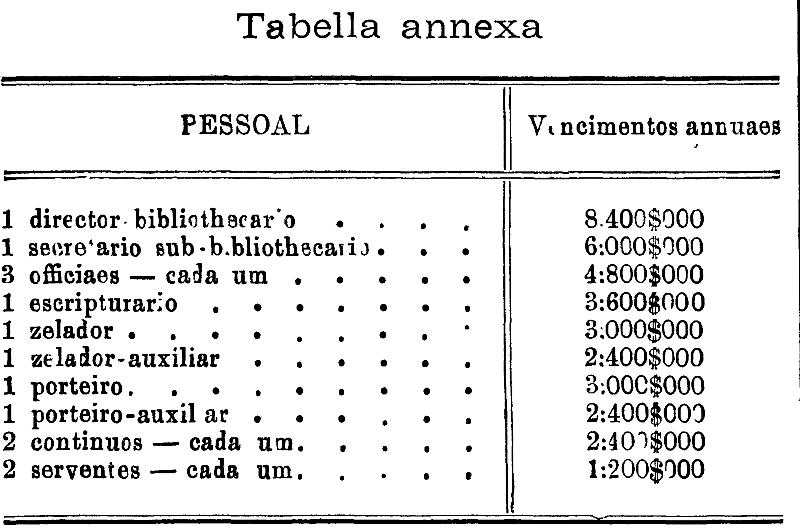 Artigo 2.° - O pessoal da Bibliotheca será o seguinte, com os vencimentos attribuidos na tabella annexa :
