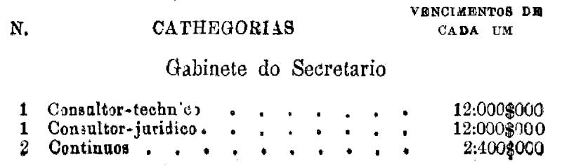 Tabella das cathegorias e vencimentos do pessoal da Secretaria de Estado dos Negocios da Agricultura, Commercio e Obras Publicas, a que se refere o Decreto n. 1992-A, de 31 de Janeiro de 1911.