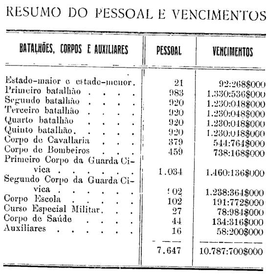 Artigo 1.º - A Força Publica do Estado, para o anno de 1915, compor-se-a do 7.647 homens, assim distribuídos: