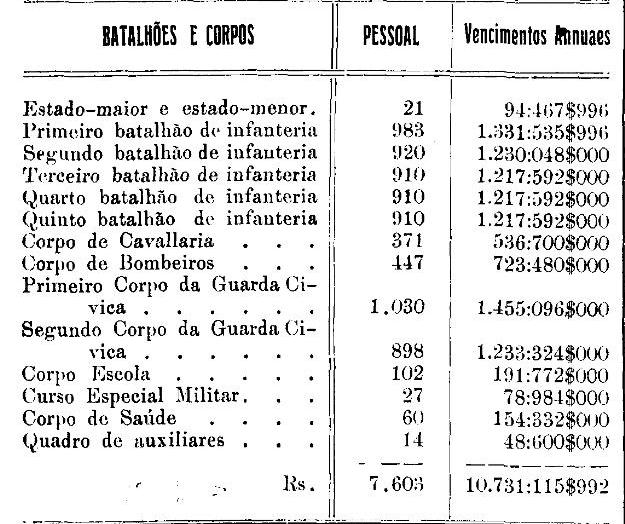 Artigo 1.° - A Força Publica do Estado, para o anno de 1916, compor-se-á de 7.603 homens, assim distribuidos: