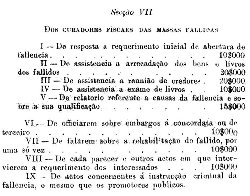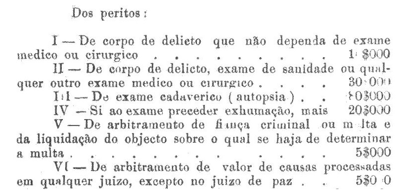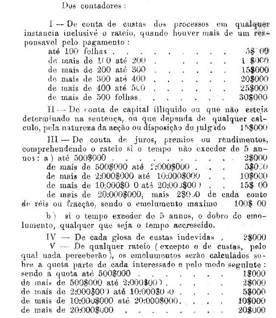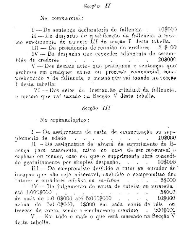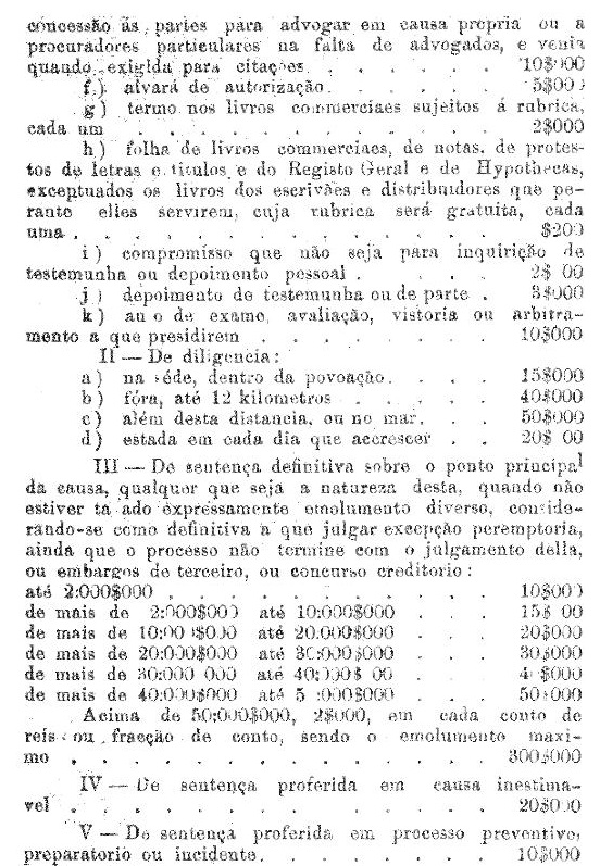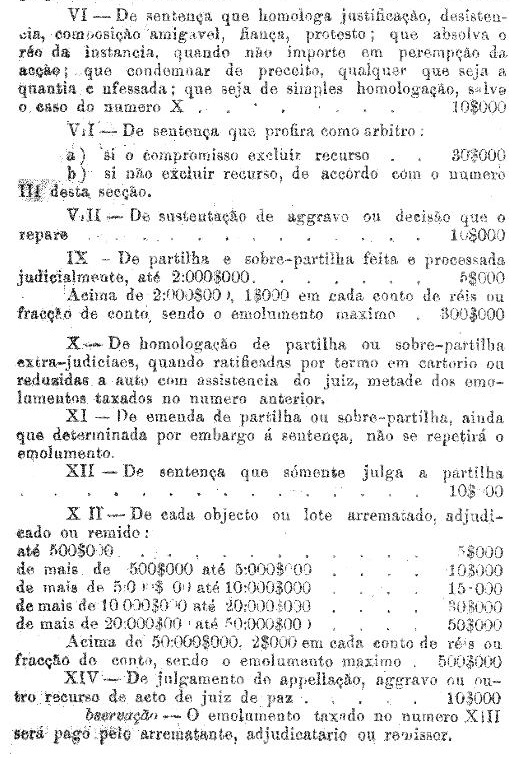 IX - De exame de livros commerciaes, de 100$000 a 500$000, conforme importancia, difficuldade e duração do trabalho, podendo os peritos, si o exame fôr muito complicado, pedir arbitramento, ao qual, entretanto, naõ fica adstricto o juiz, a quem será licito recusal-o no todo ou em parte.
