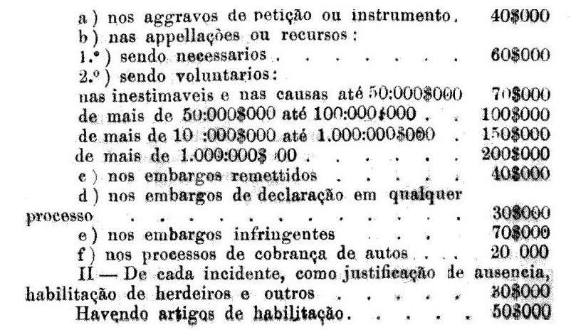 VII - De arbitramento de honorarios medicos, de advogados, de salarios por servi o de outra natureza ou de fructos, de interesses, perdas e damnos e de qualquer outro facto, obrigação ou compromisso dependentes de liquidação, de 20$000 a 200$000, marcadopelo juiz conforme o trabalho e a importancia da causa.