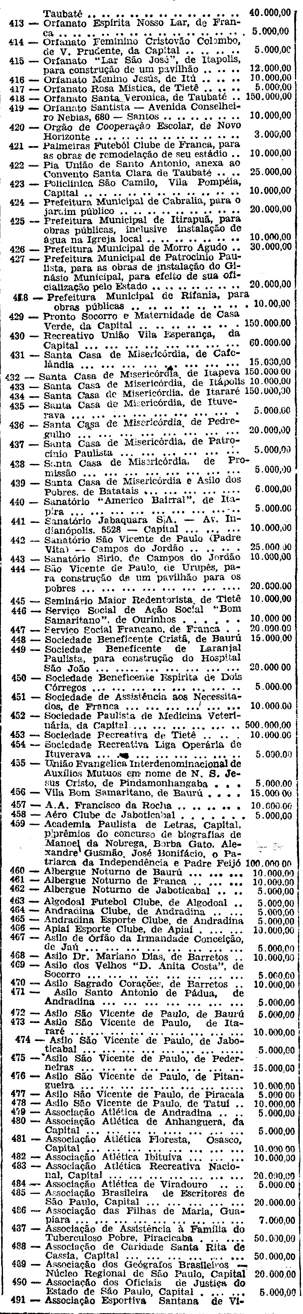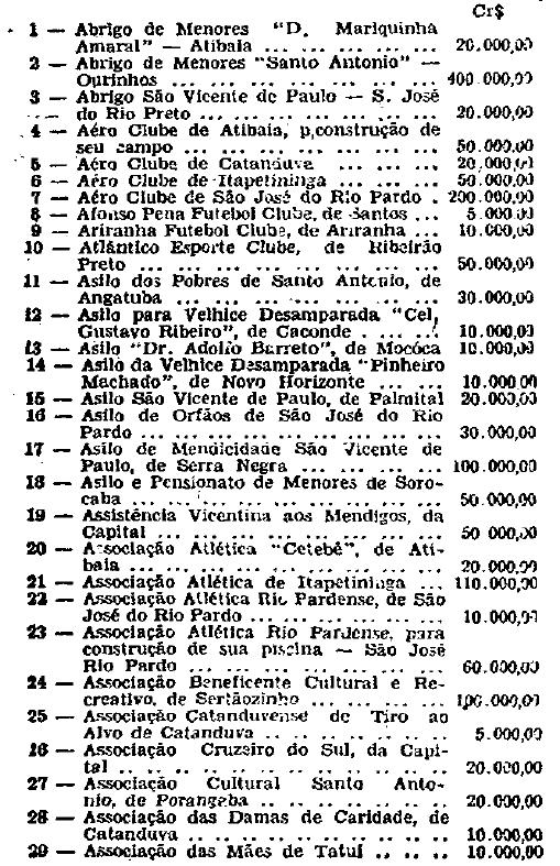 Artigo 1.º - São concedidos no corrente exercício, às antidades abaixo relacionadas, os seguintes, auxílios: