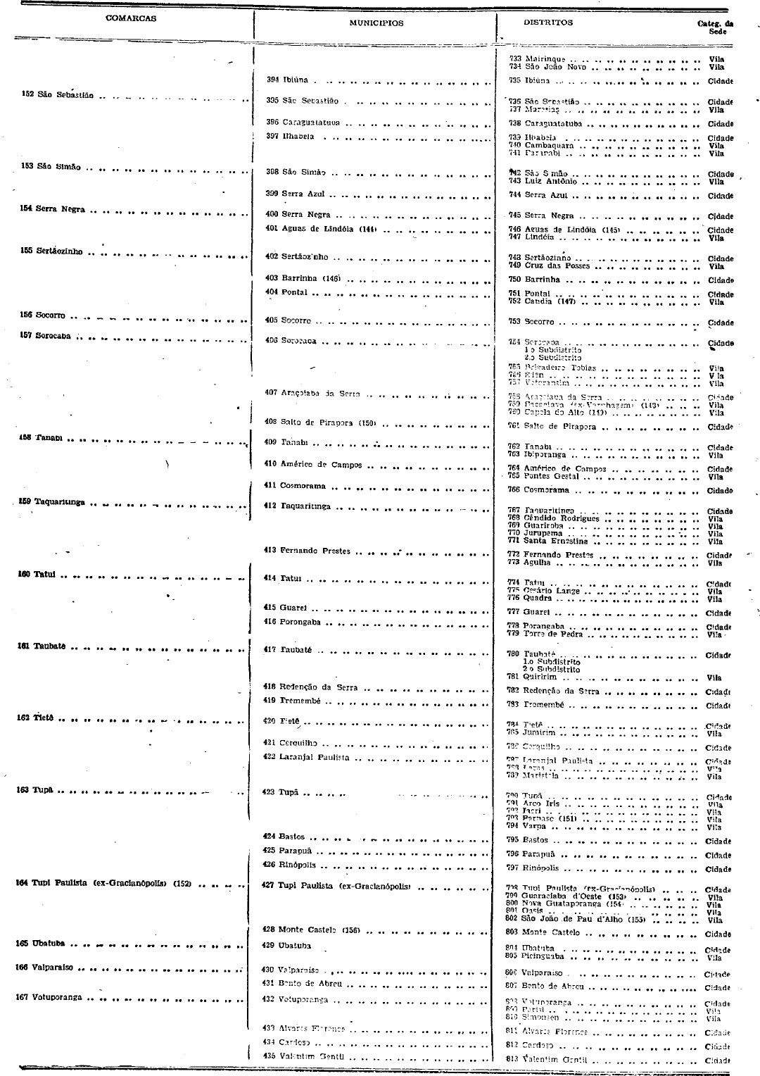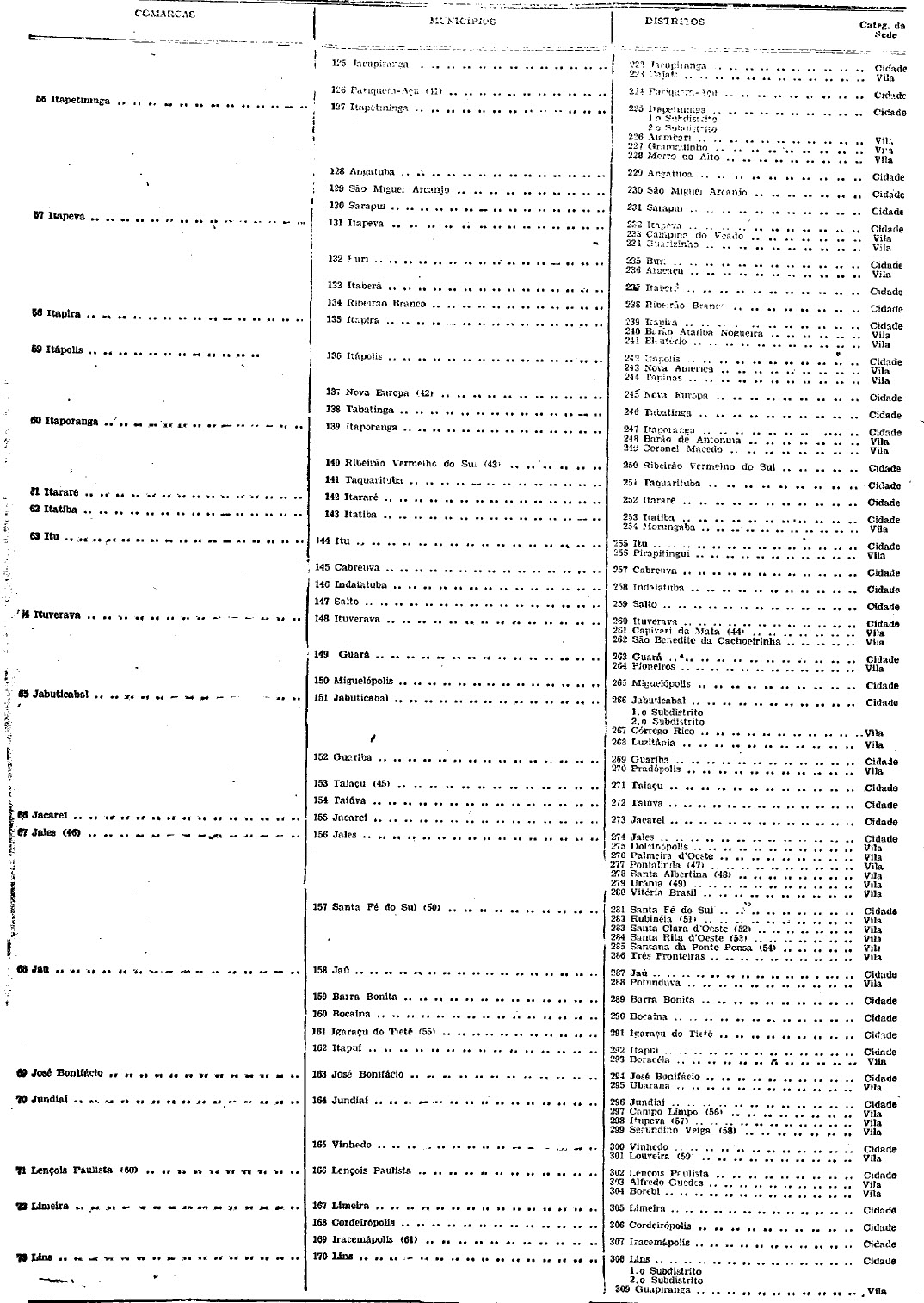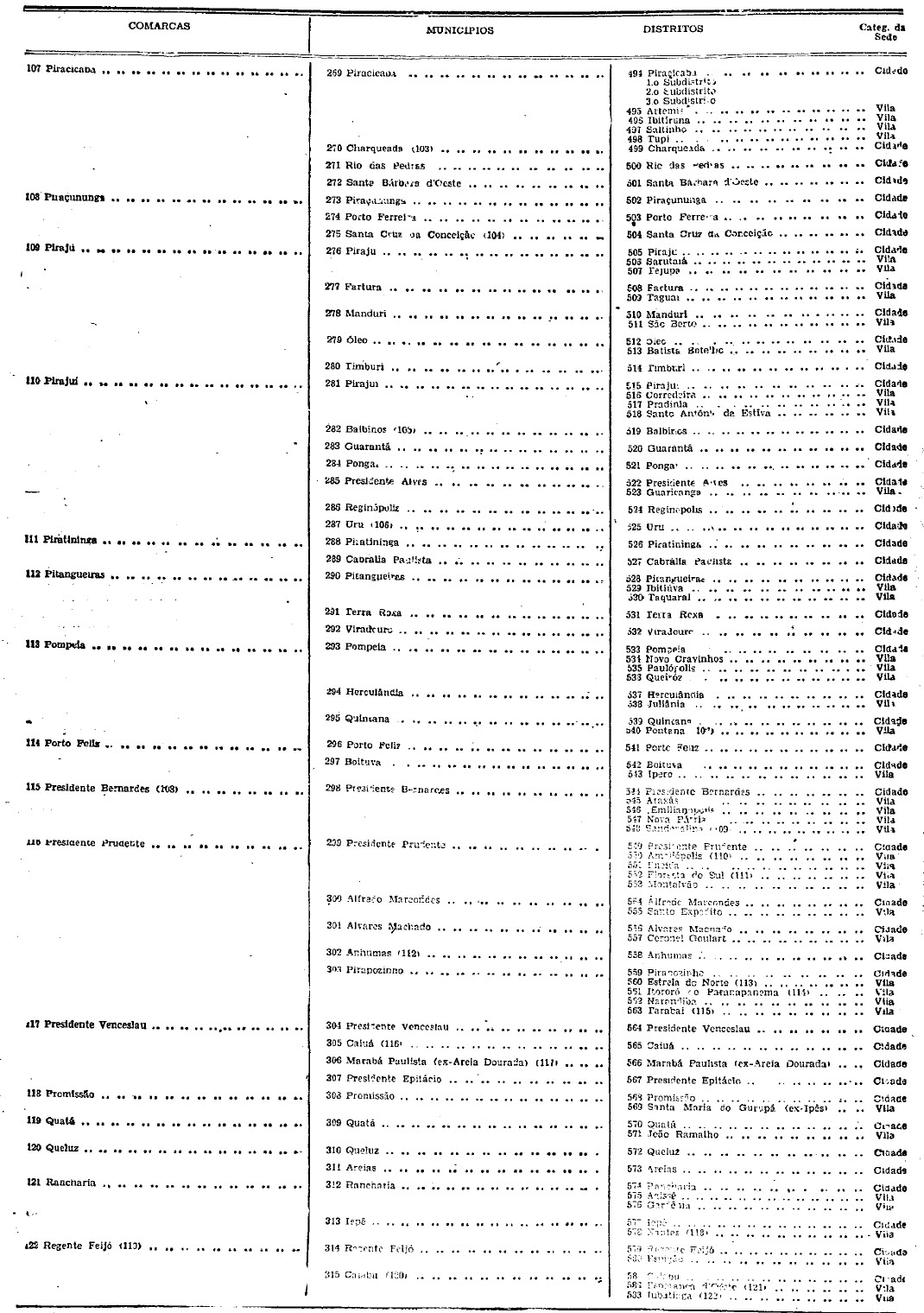 territorial, com indicação da categoria das respectivas sedes que têm a