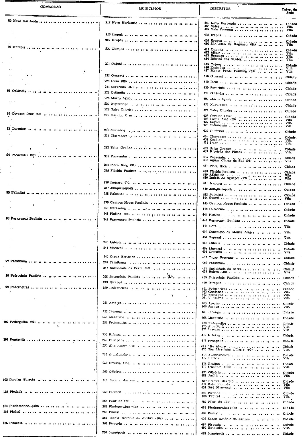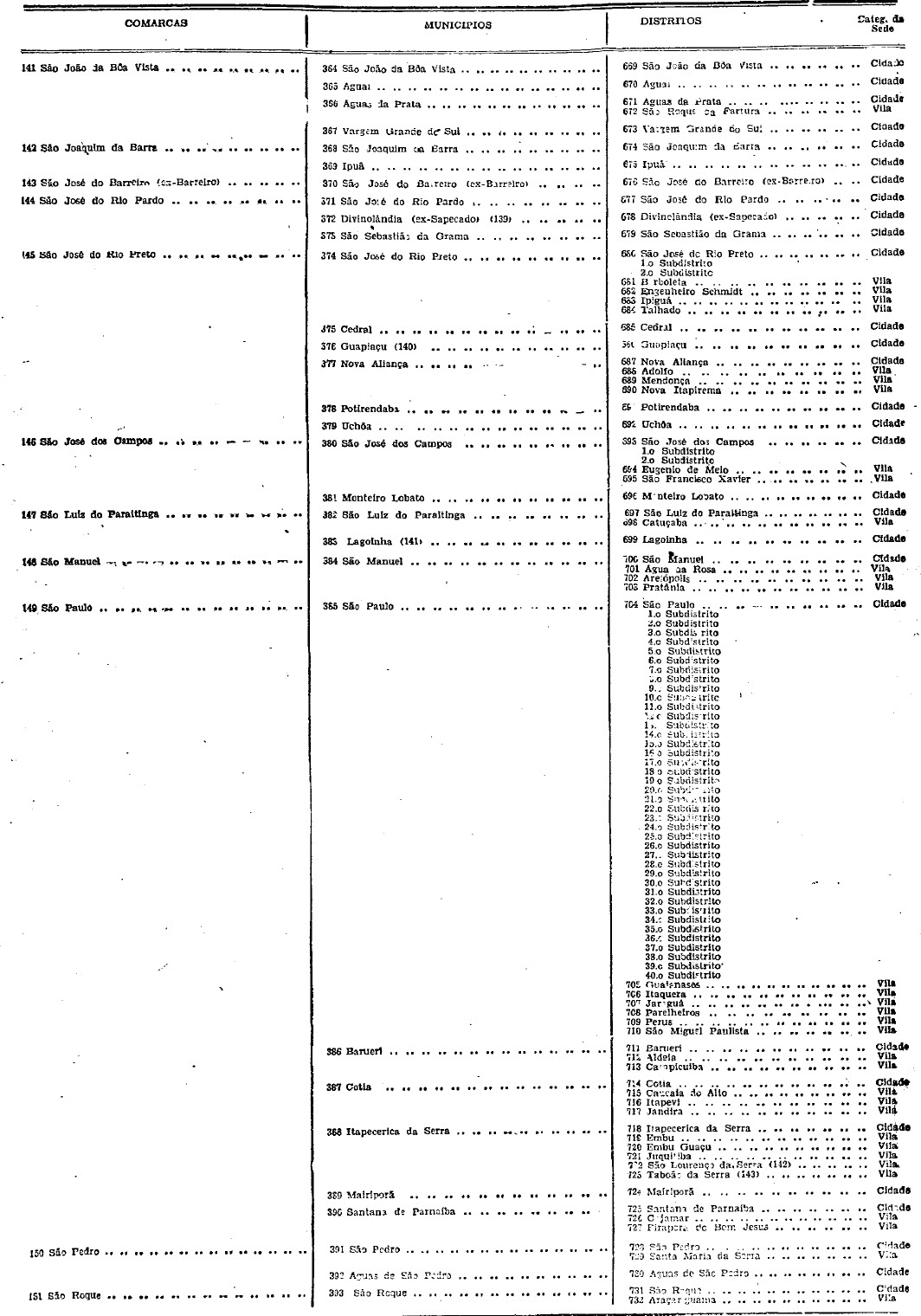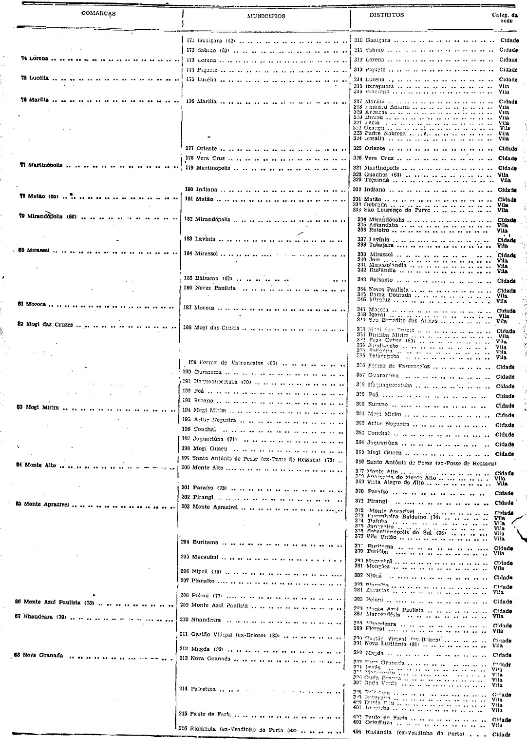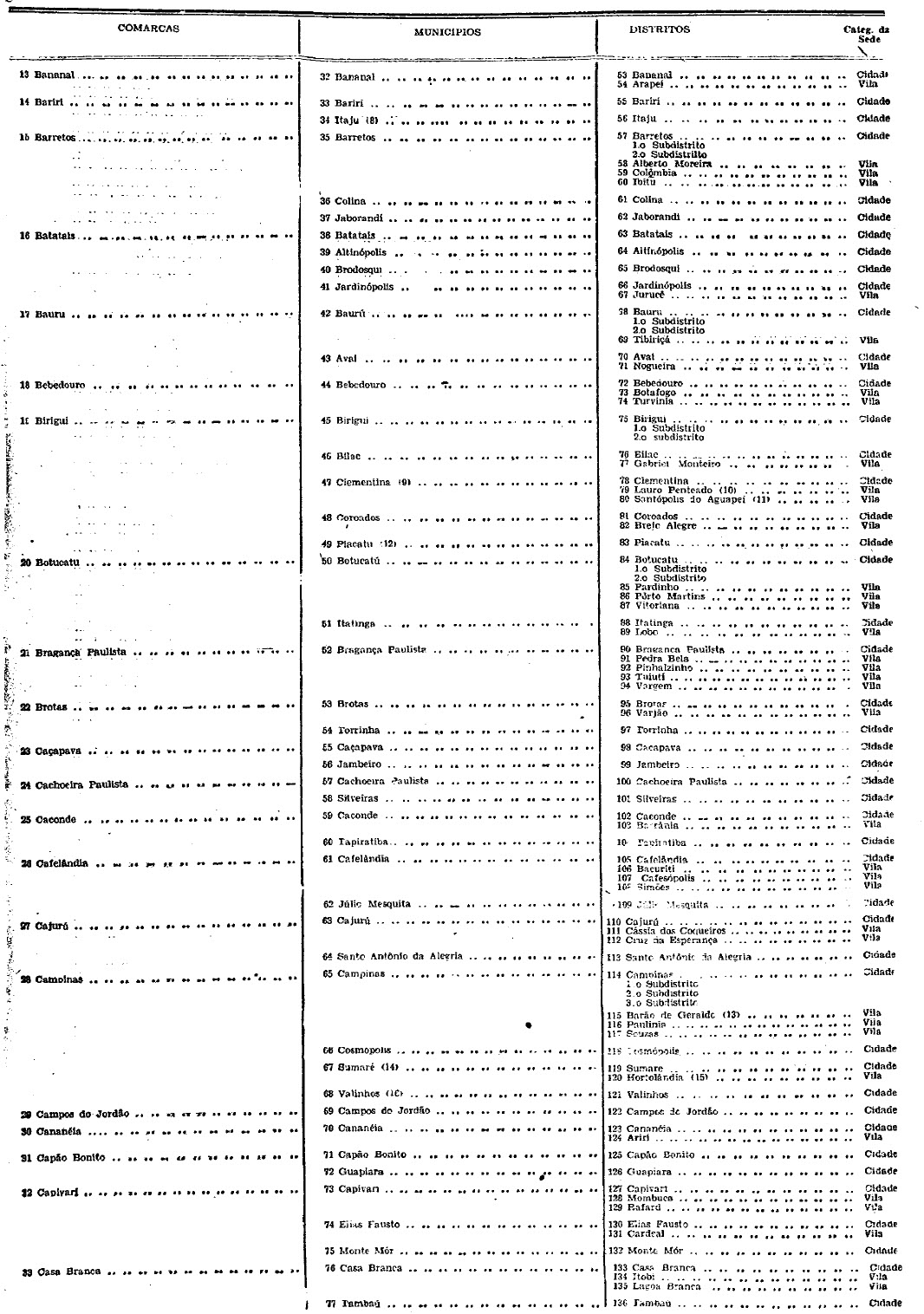 territorial, com indicação da categoria das respectivas sedes que têm a