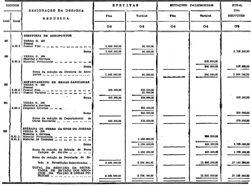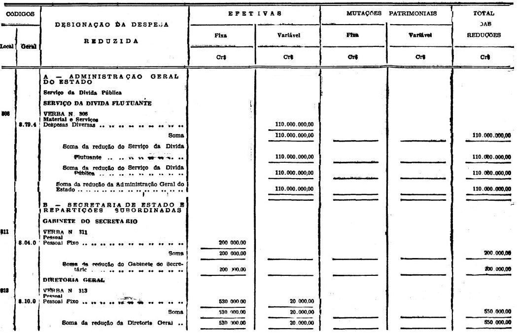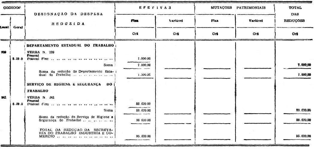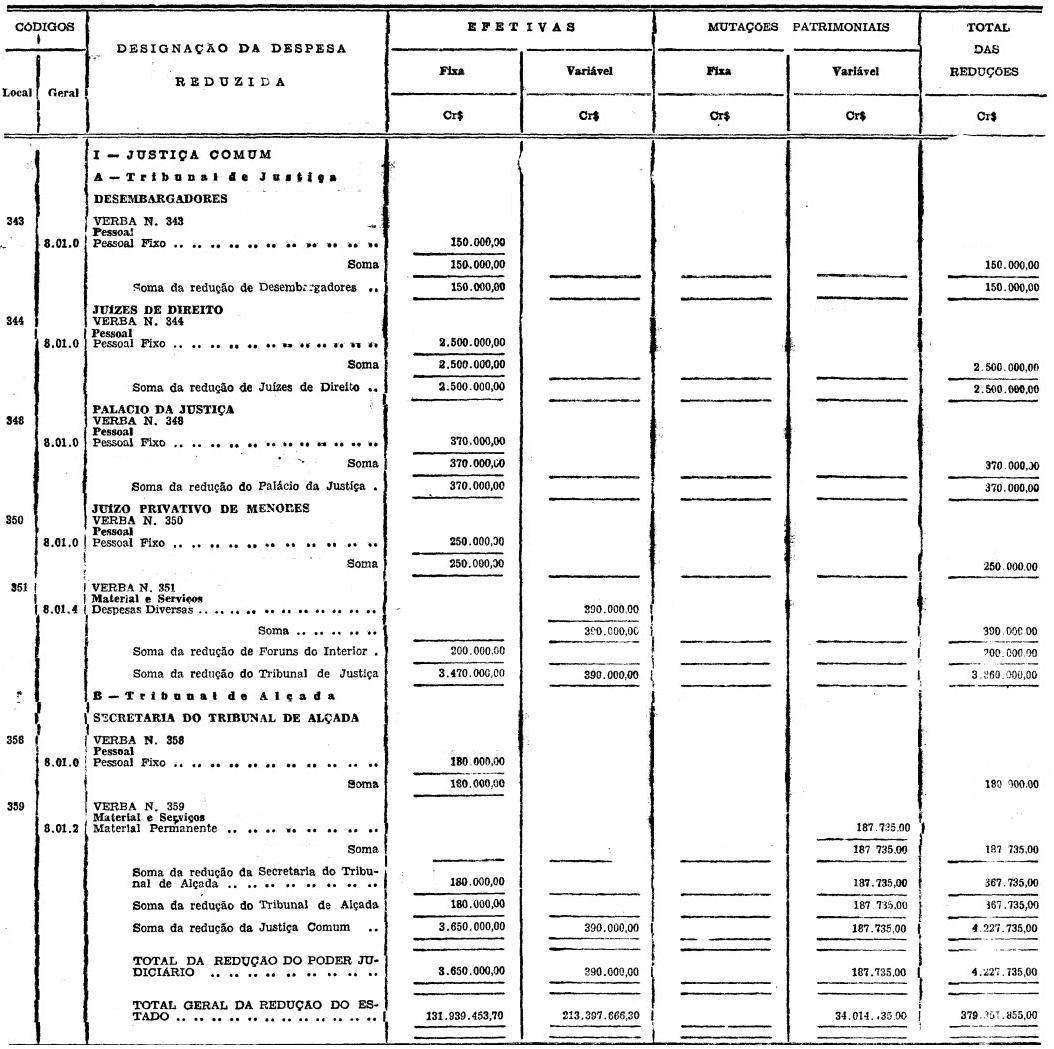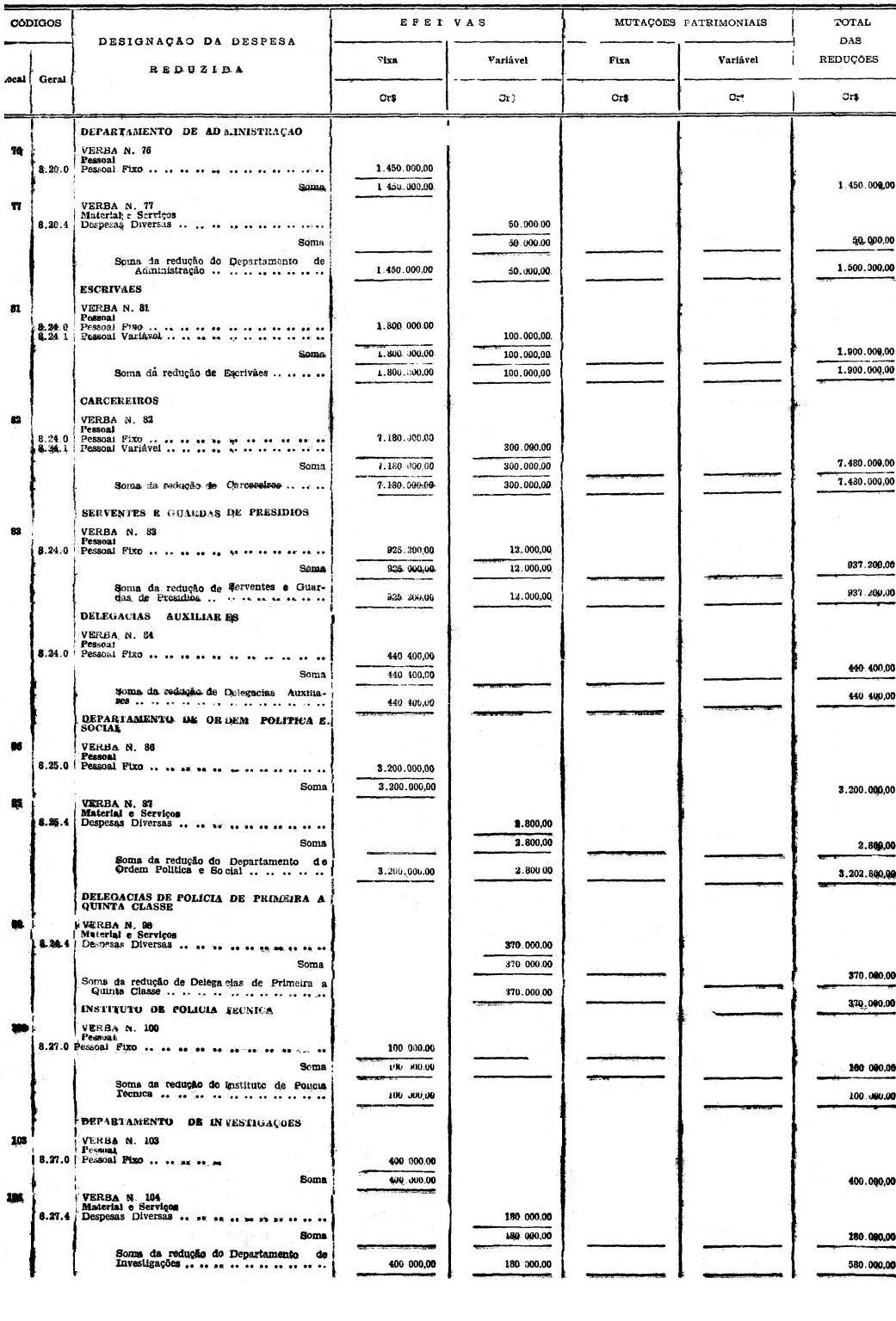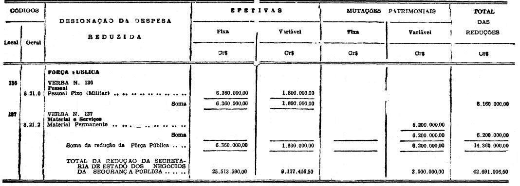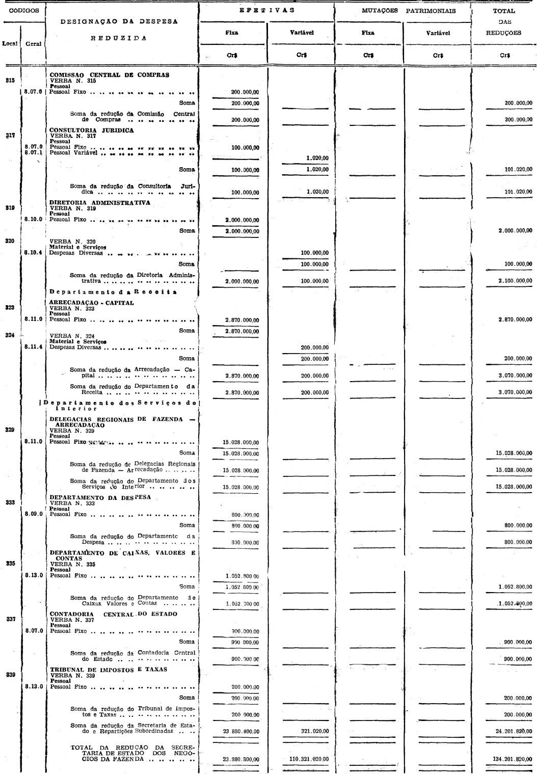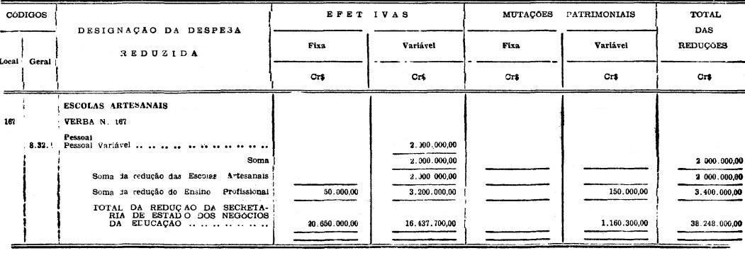 Artigo 1º - Ficam reduzidas, na importância total de Cr$ 379.351.855,00 (TREZENTOS E SETENTA E NOVE MILHÕES, TREZENTOS E CINQUENTA E UM MIL, OITOCENTOS E CINQUENTA E CINCO CRUZEIROS), as verbas do orçamento vigente abaixo discriminadas: