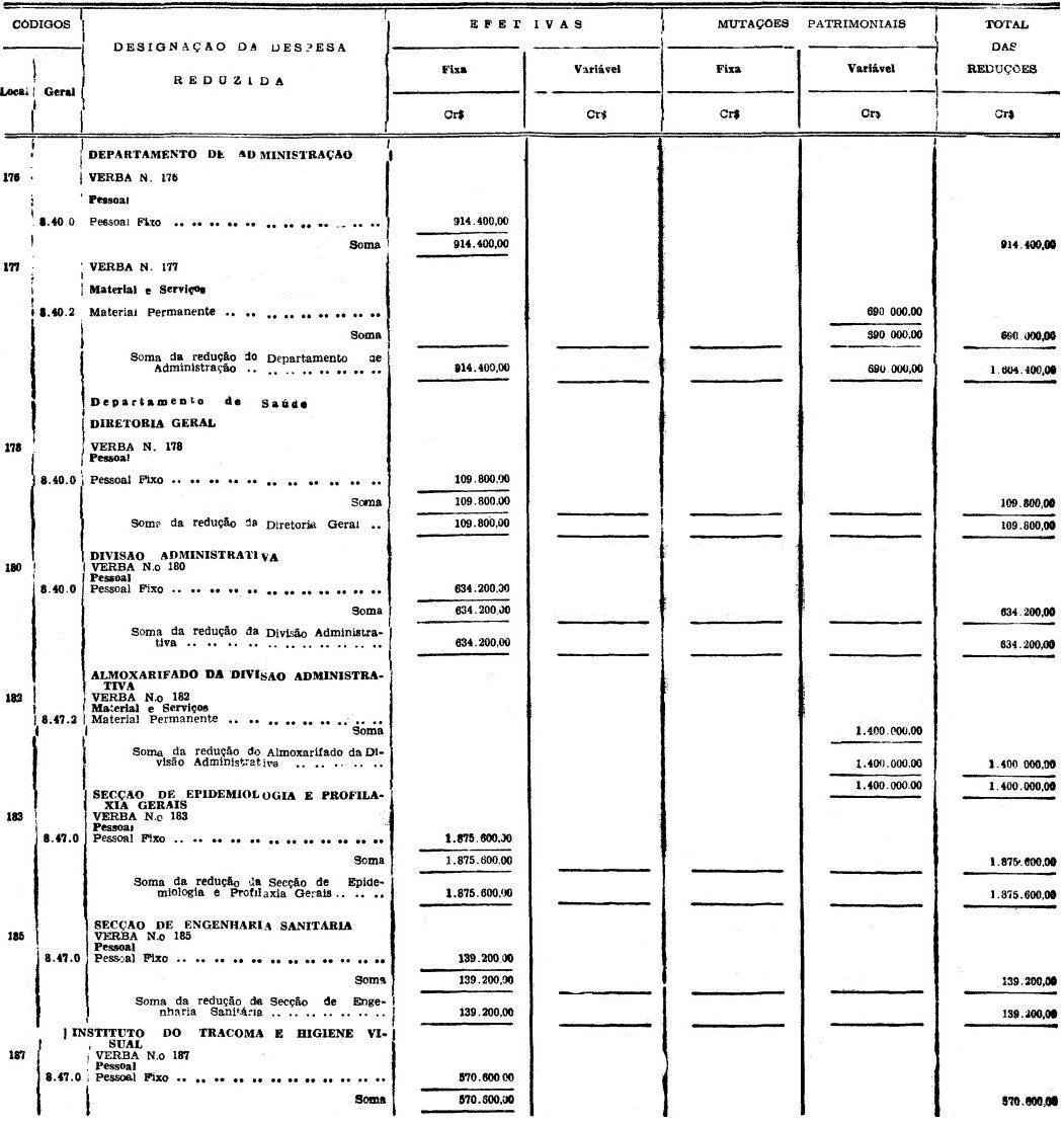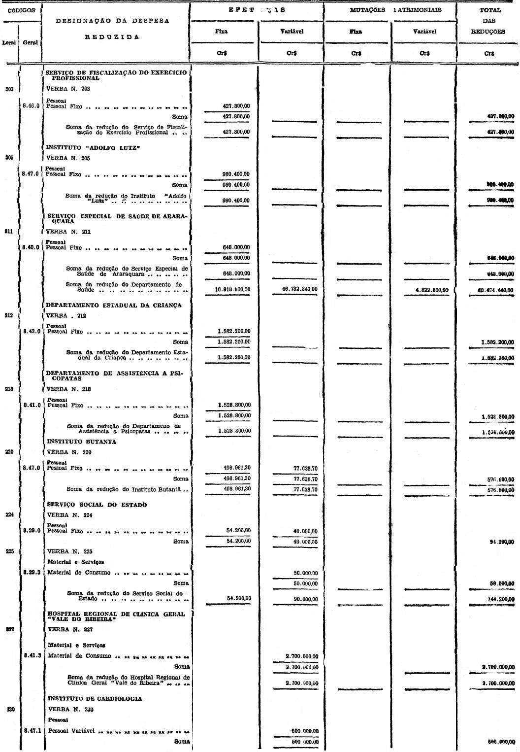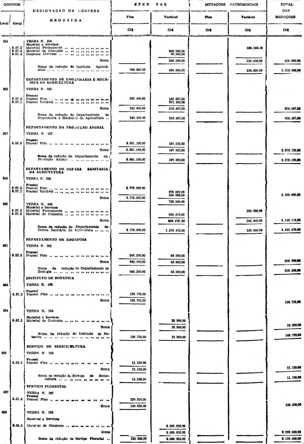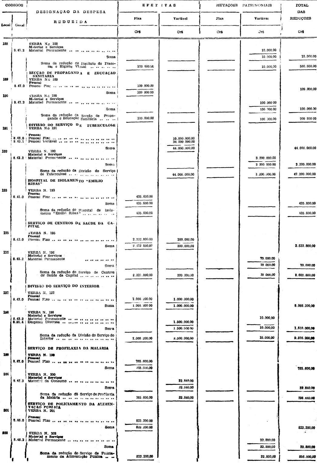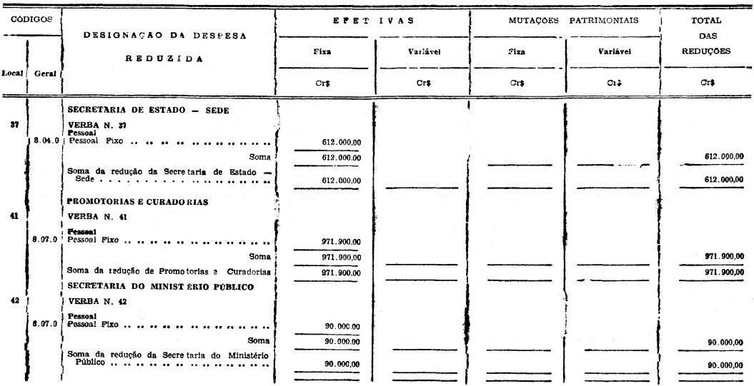 Artigo 1º - Ficam reduzidas, na importância total de Cr$ 379.351.855,00 (TREZENTOS E SETENTA E NOVE MILHÕES, TREZENTOS E CINQUENTA E UM MIL, OITOCENTOS E CINQUENTA E CINCO CRUZEIROS), as verbas do orçamento vigente abaixo discriminadas: