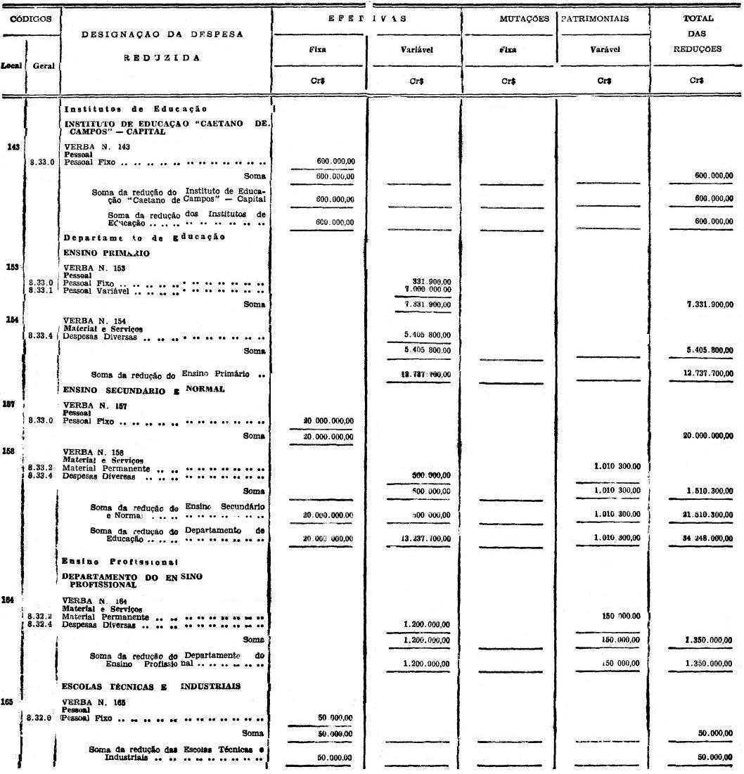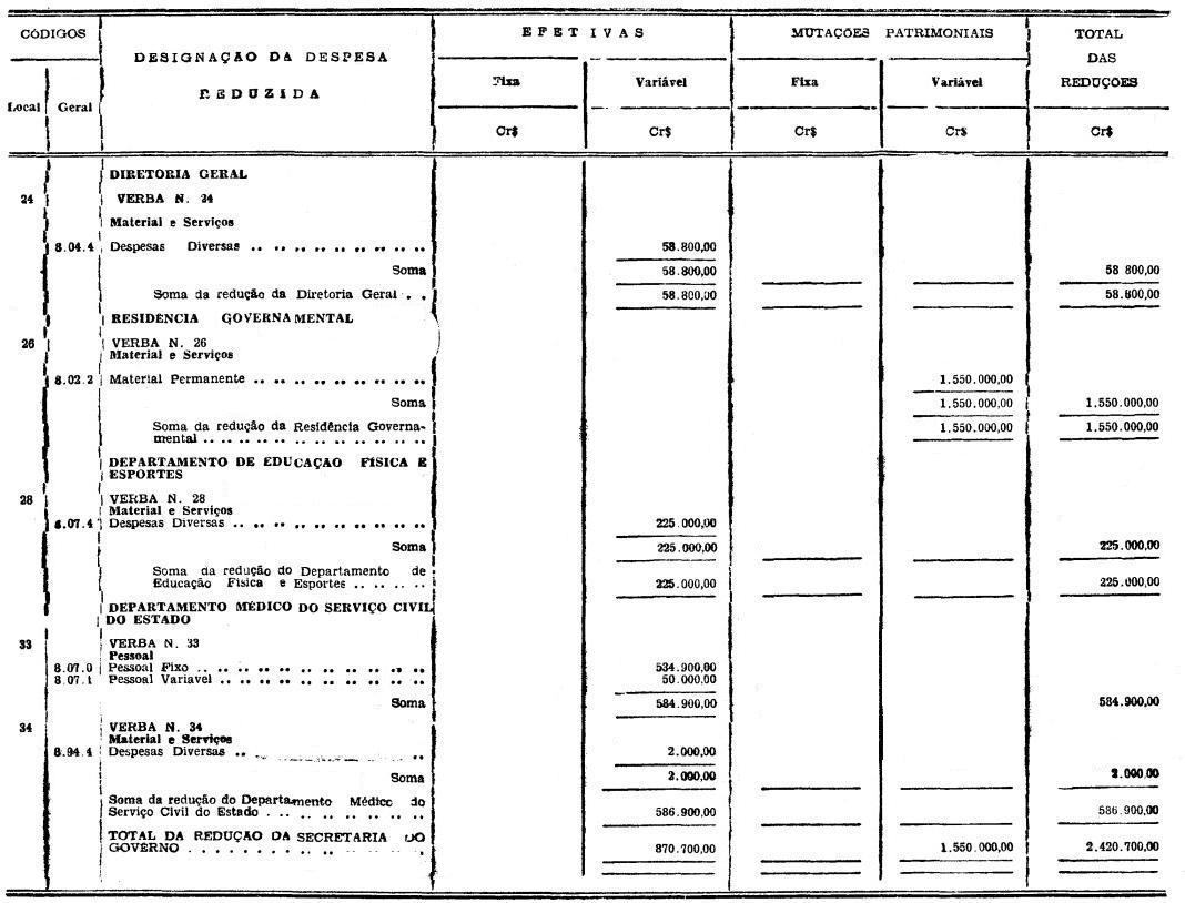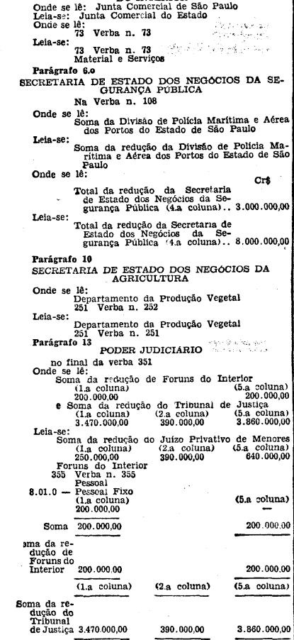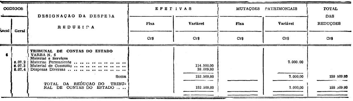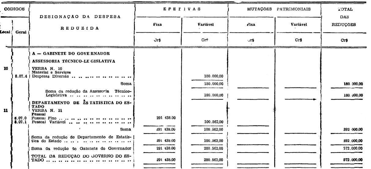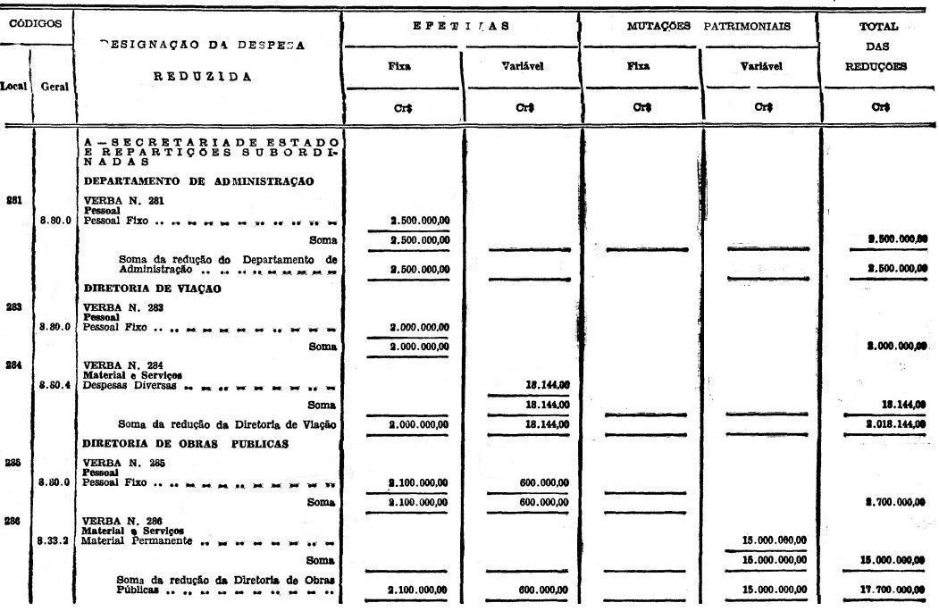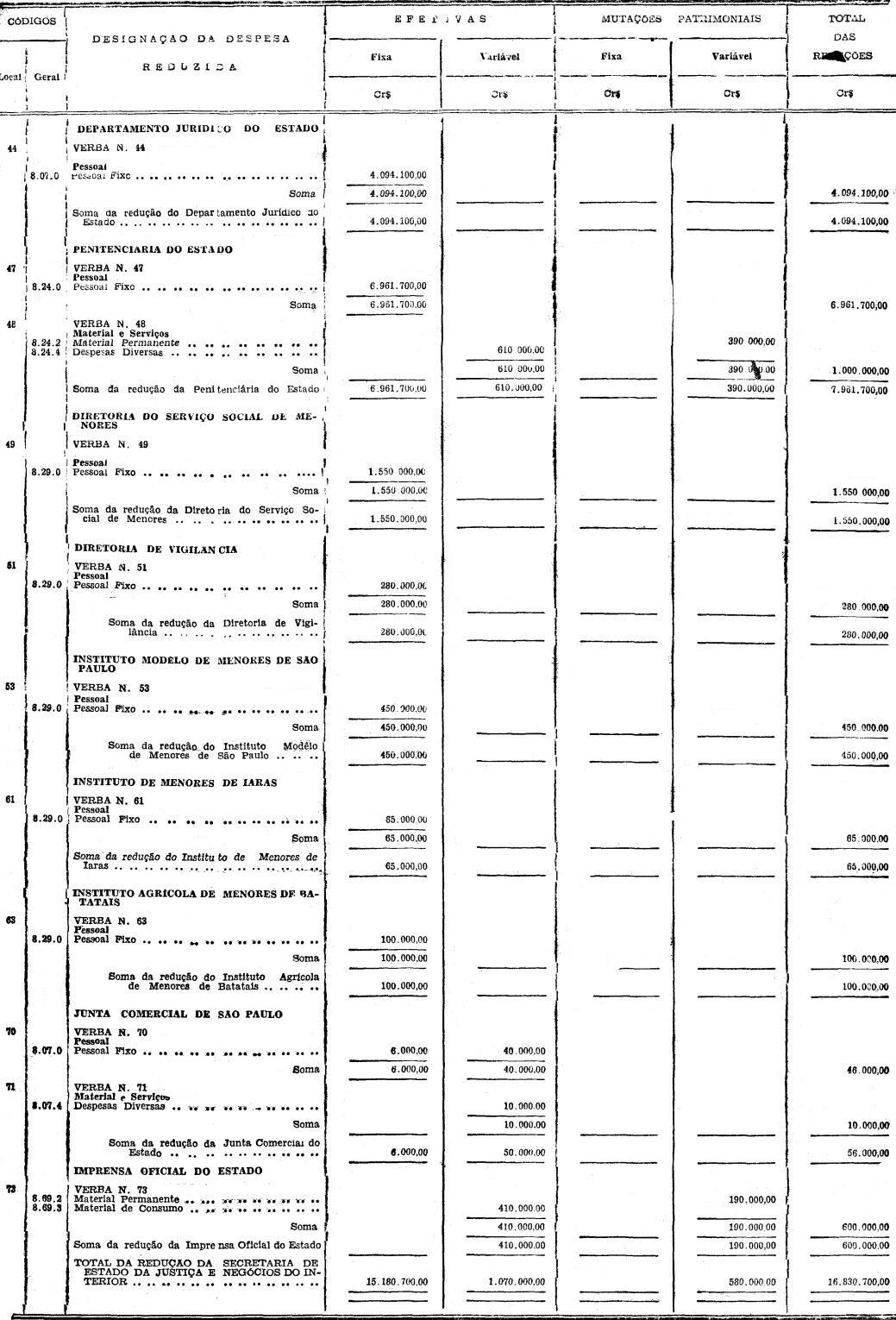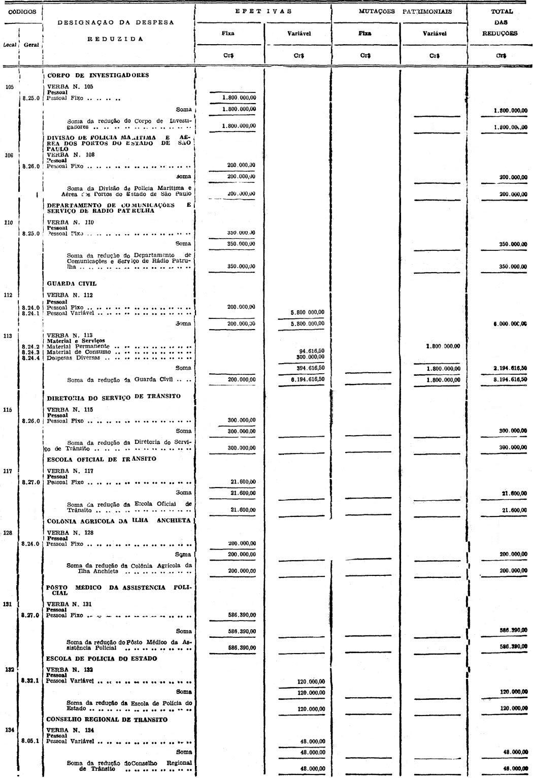 Artigo 1º - Ficam reduzidas, na importância total de Cr$ 379.351.855,00 (TREZENTOS E SETENTA E NOVE MILHÕES, TREZENTOS E CINQUENTA E UM MIL, OITOCENTOS E CINQUENTA E CINCO CRUZEIROS), as verbas do orçamento vigente abaixo discriminadas:
