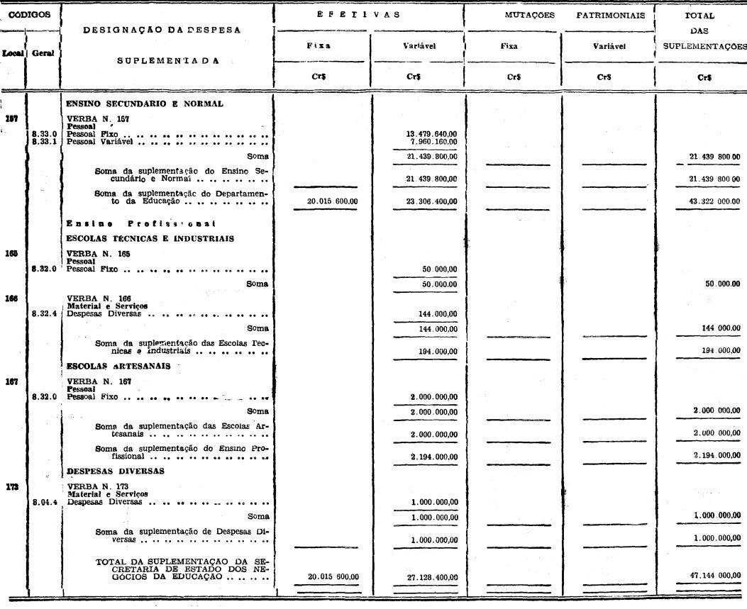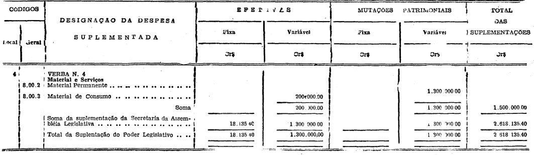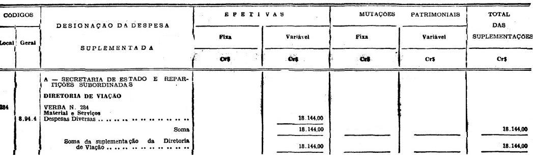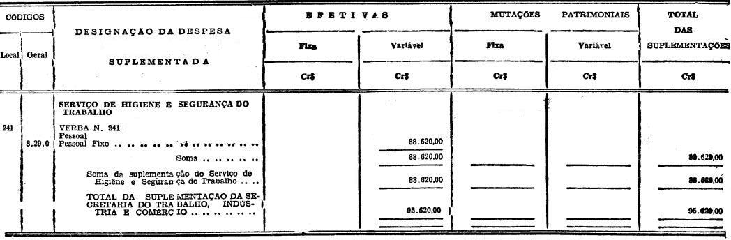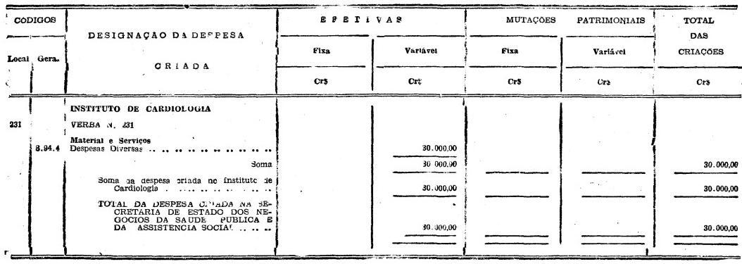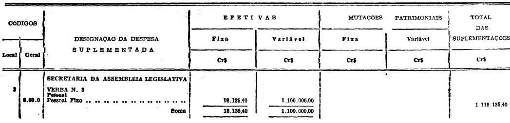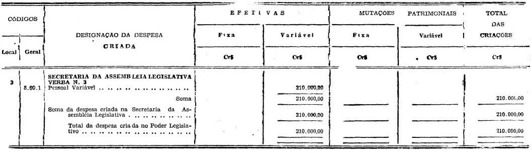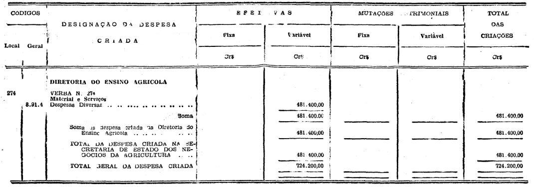 Artigo 3º - Ficam criadas, no orçamento vigente, no total de Cr$ 724.200,00 (SETECENTOS E VINTE E QUATRO MIL E DUZENTOS CRUZEIROS), as dotações abaixo discriminadas: