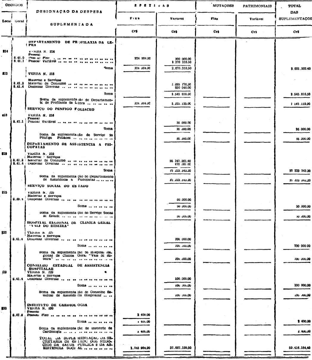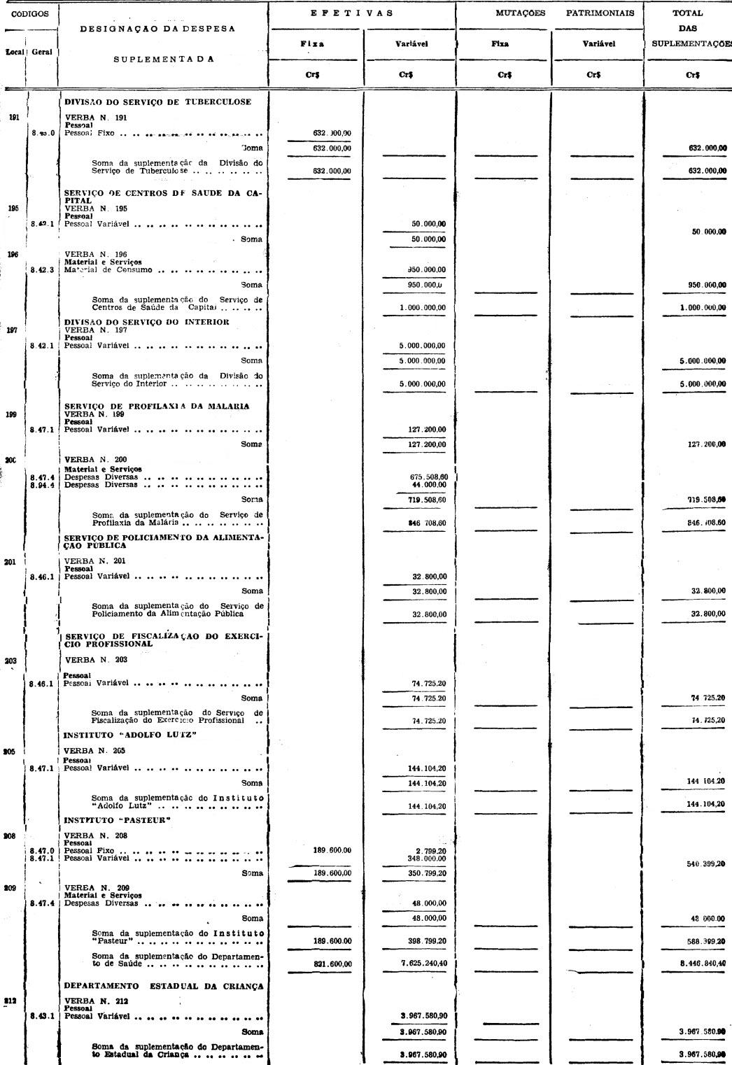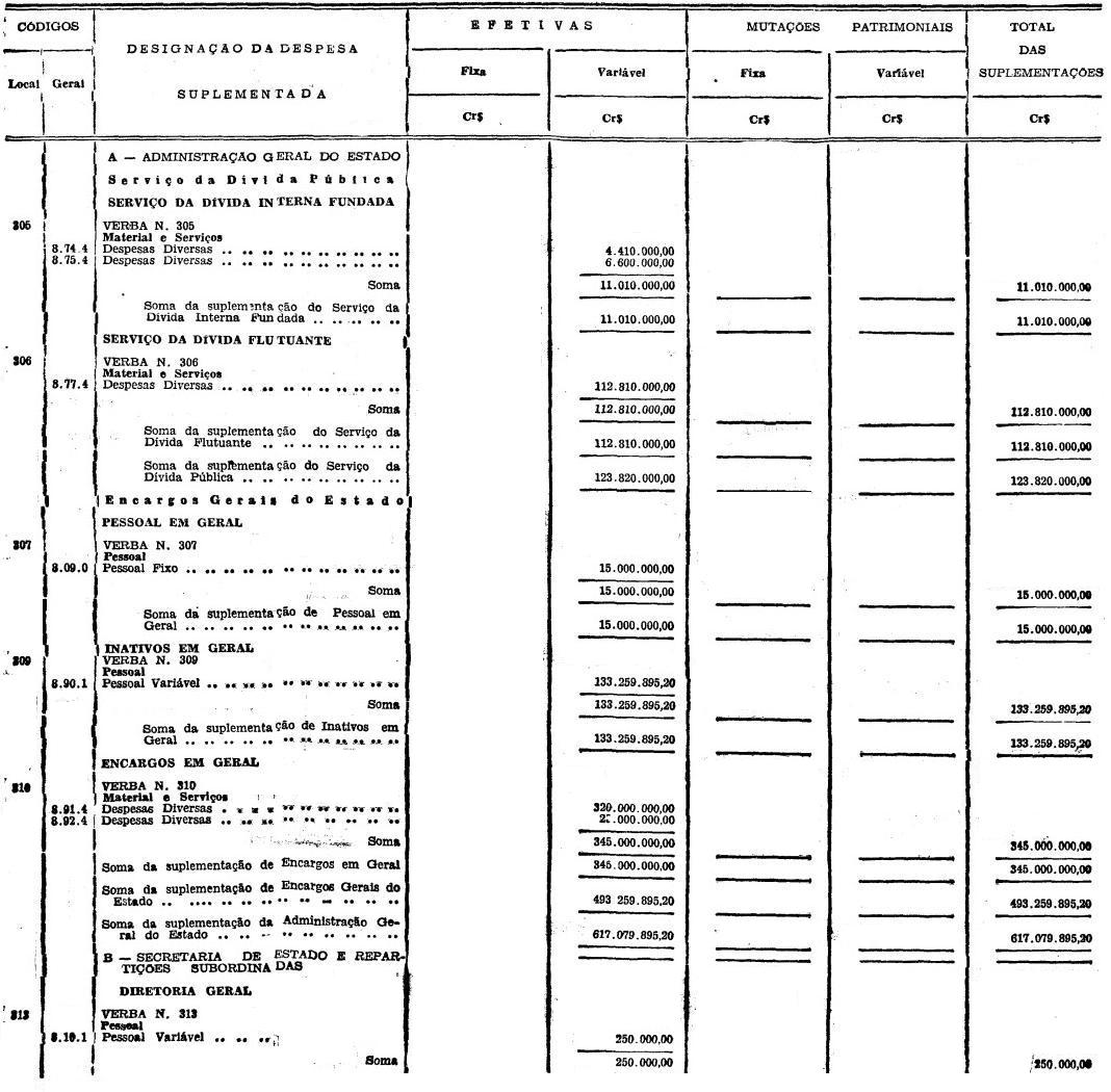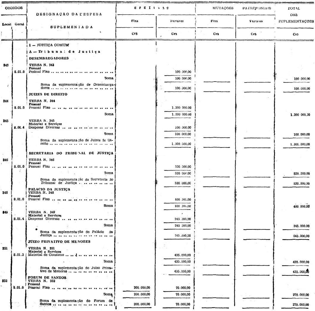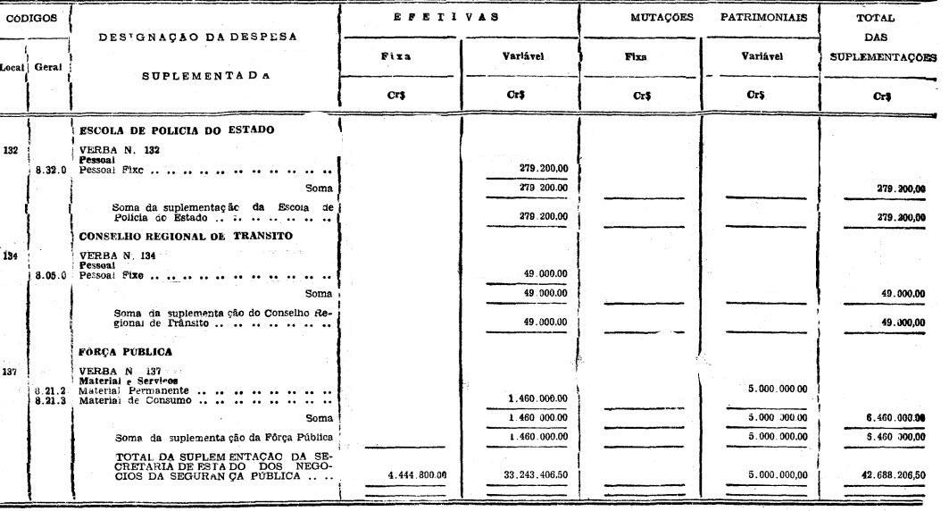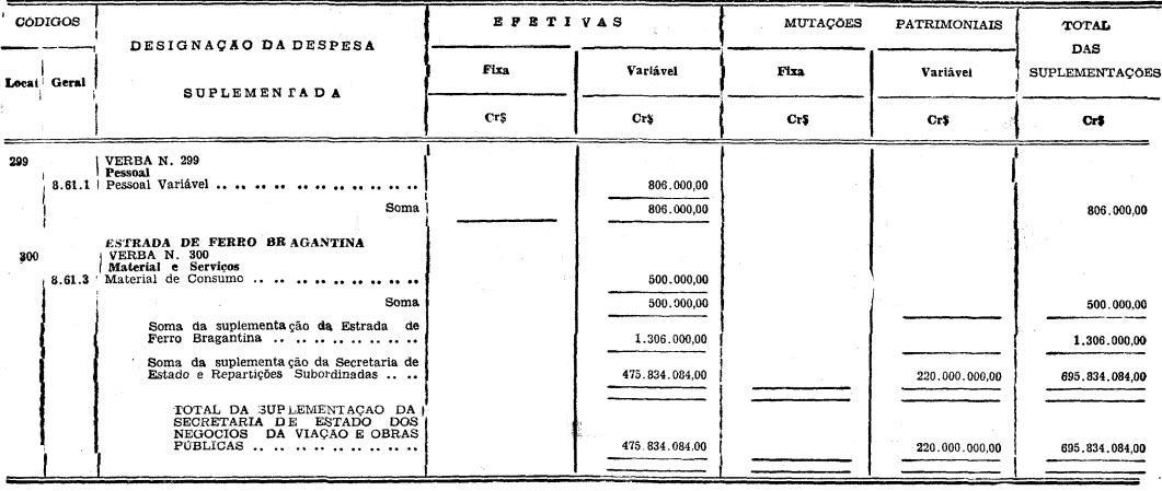 Artigo 2º - Ficam suplementadas, na importância de Cr$ 1.707.851.806,90 (UM BILHÃO, SETECENTOS E SETE MILHÕES, OITOCENTOS E CINQUENTA E UM MIL, OITOCENTOS E SEIS CRUZEIROS E NOVENTA CENTAVOS), as verbas do orçamento vigente abaixo discriminadas: