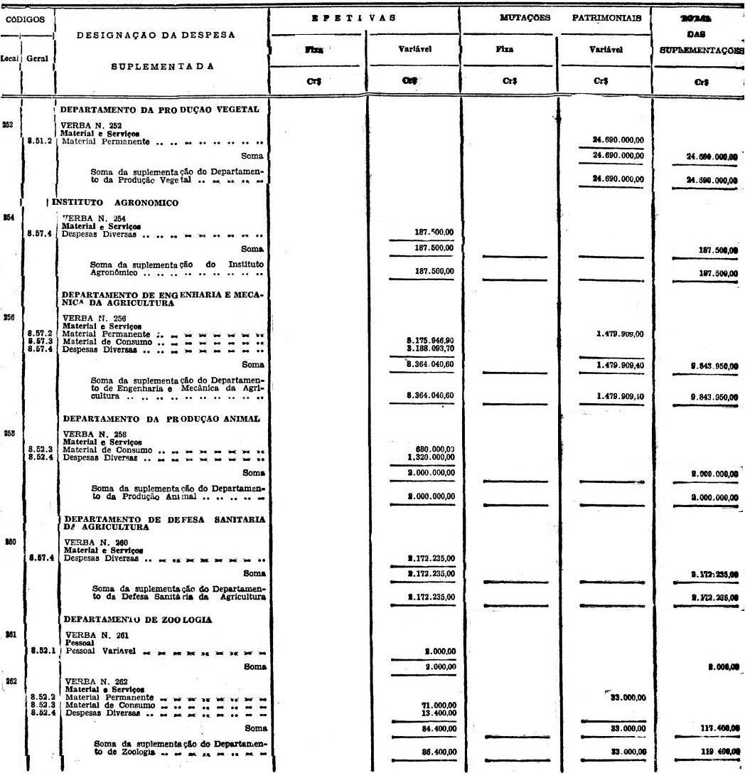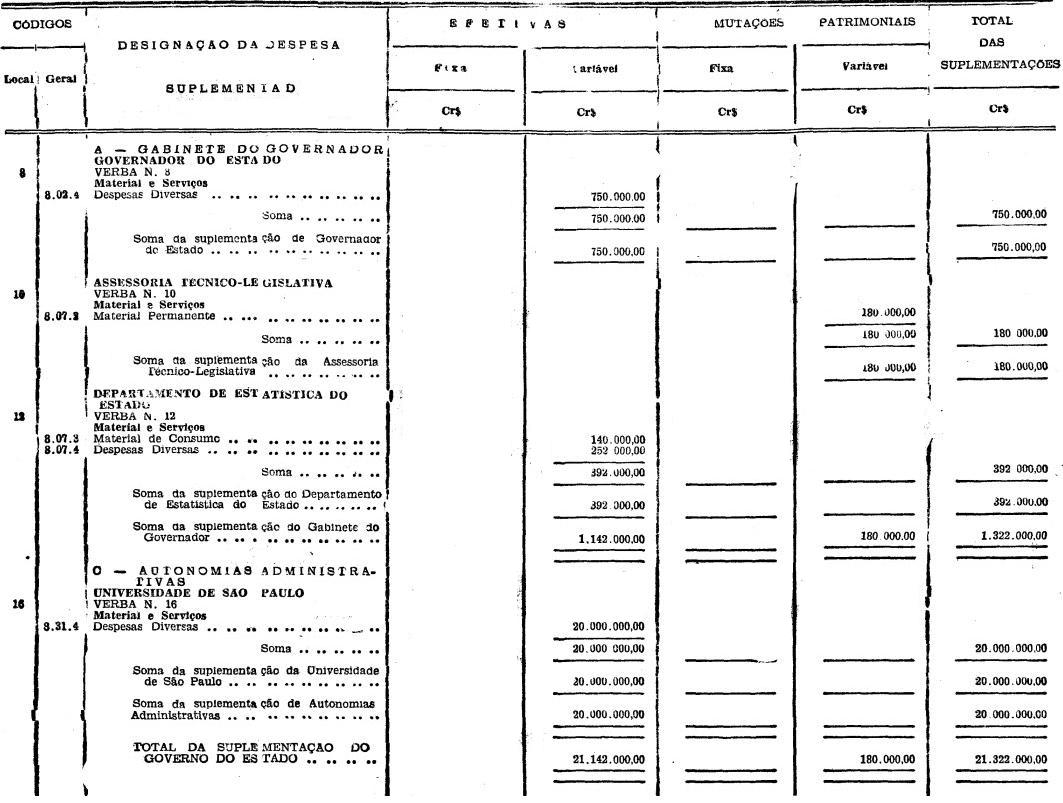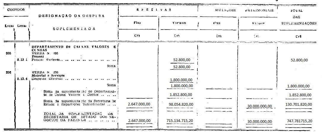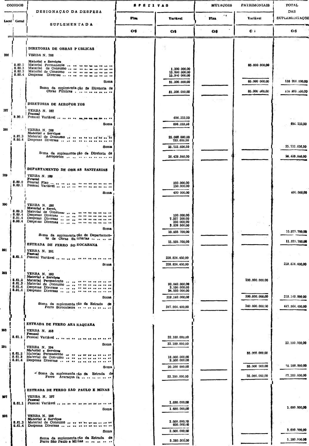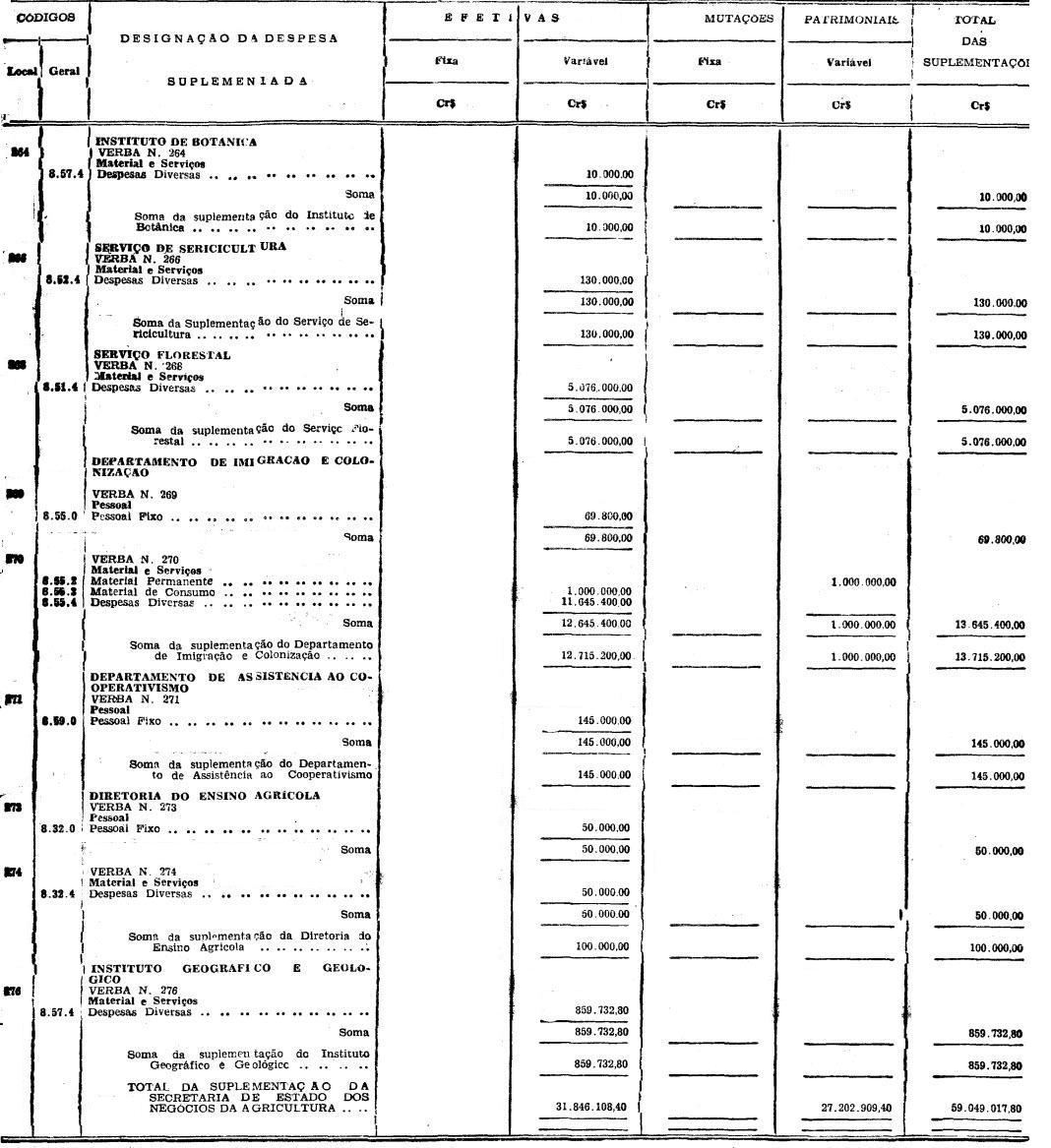 Artigo 2º - Ficam suplementadas, na importância de Cr$ 1.707.851.806,90 (UM BILHÃO, SETECENTOS E SETE MILHÕES, OITOCENTOS E CINQUENTA E UM MIL, OITOCENTOS E SEIS CRUZEIROS E NOVENTA CENTAVOS), as verbas do orçamento vigente abaixo discriminadas:
