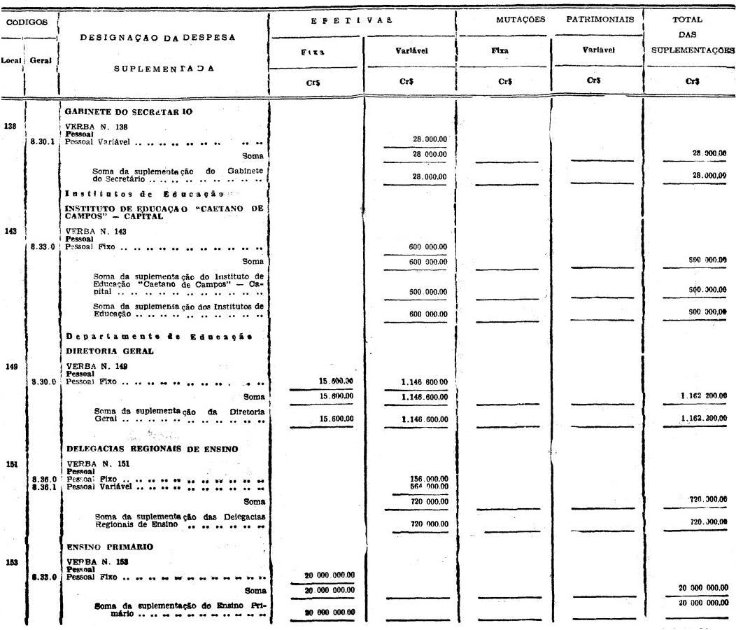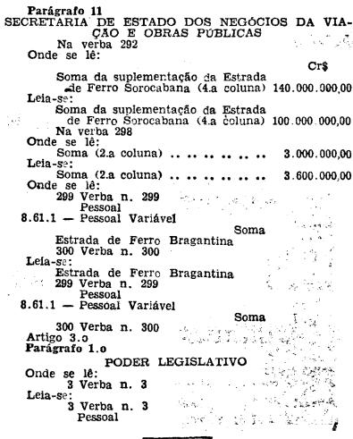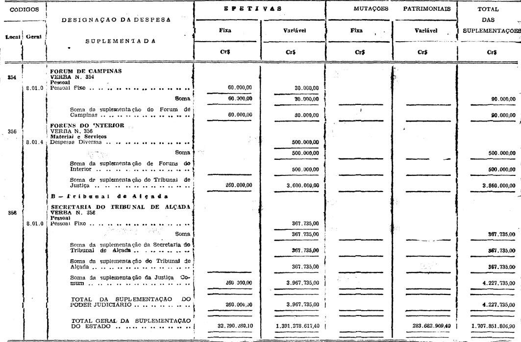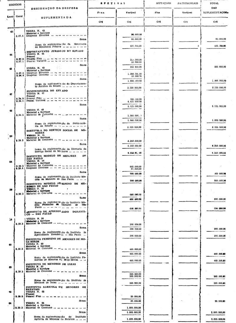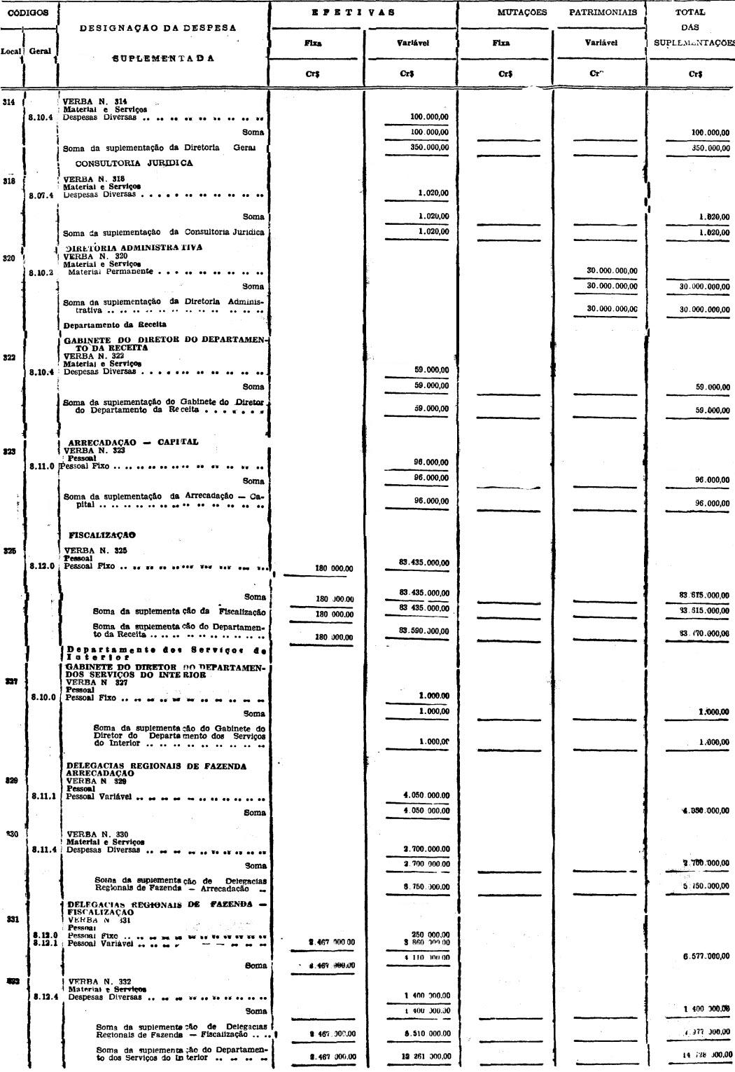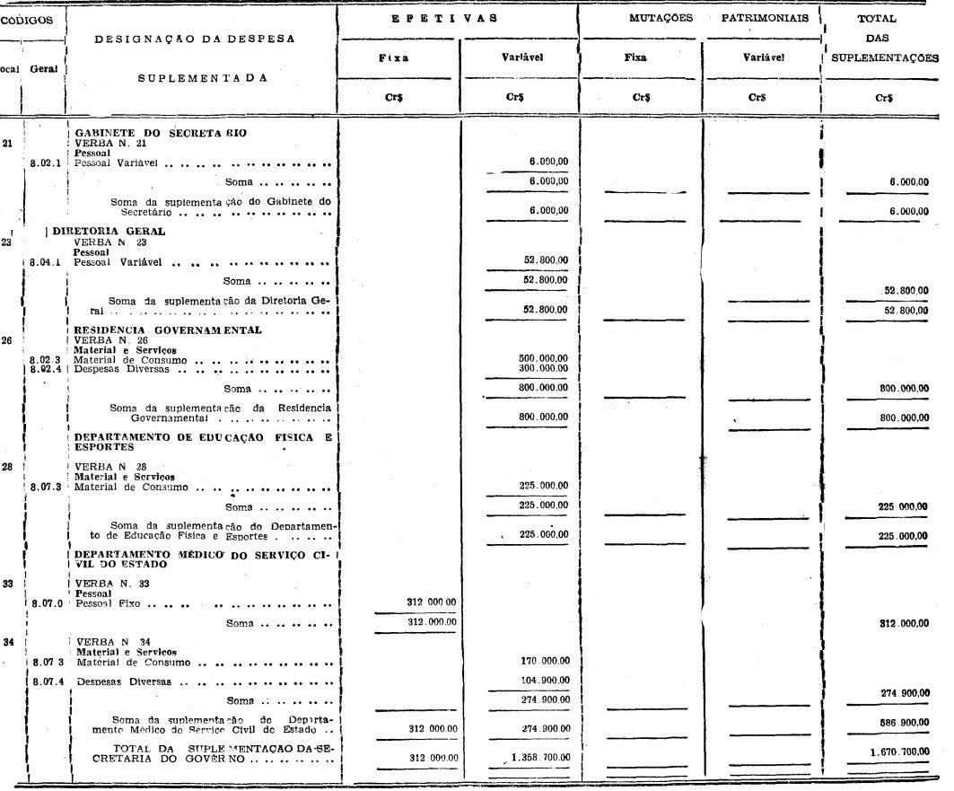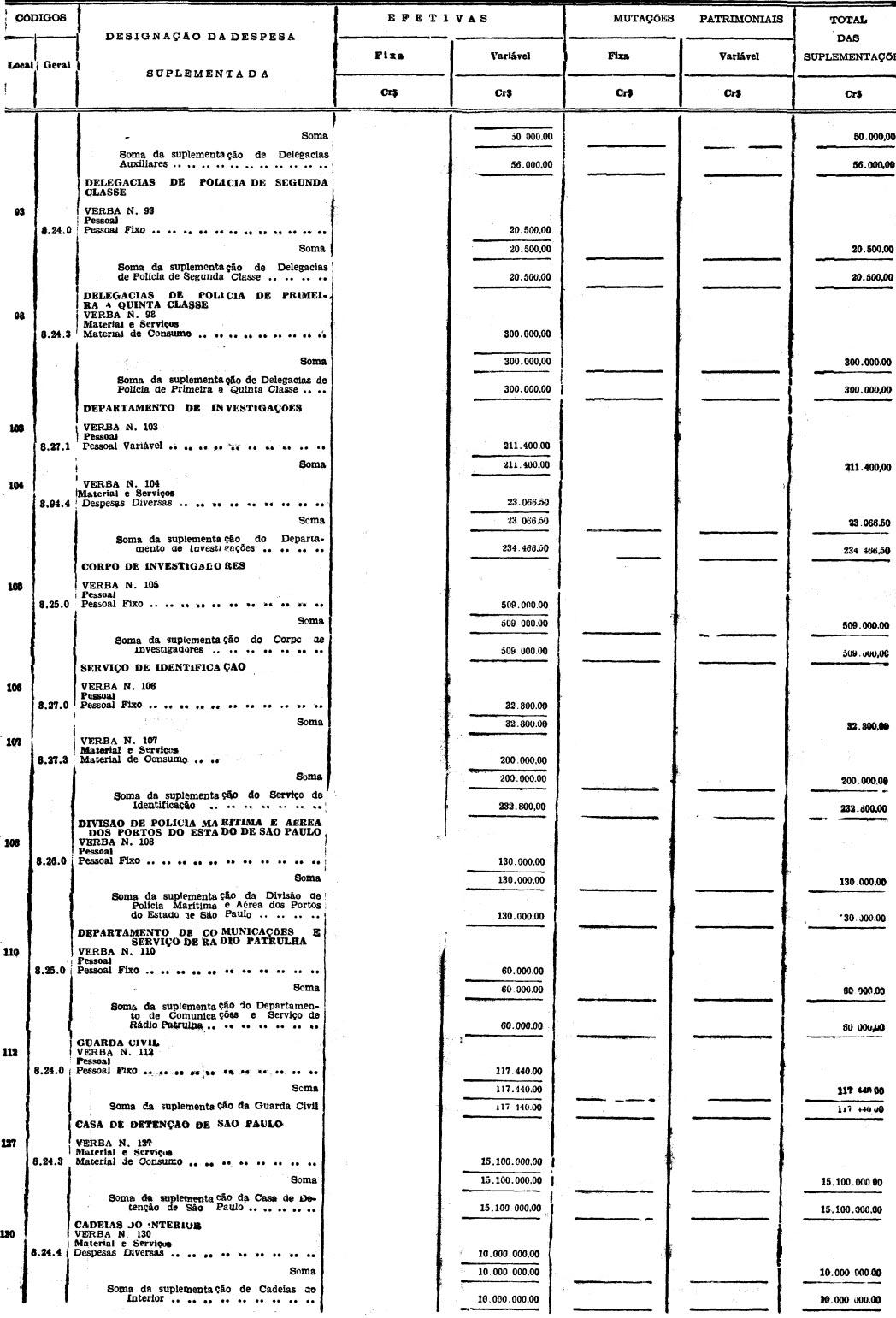 Artigo 2º - Ficam suplementadas, na importância de Cr$ 1.707.851.806,90 (UM BILHÃO, SETECENTOS E SETE MILHÕES, OITOCENTOS E CINQUENTA E UM MIL, OITOCENTOS E SEIS CRUZEIROS E NOVENTA CENTAVOS), as verbas do orçamento vigente abaixo discriminadas: