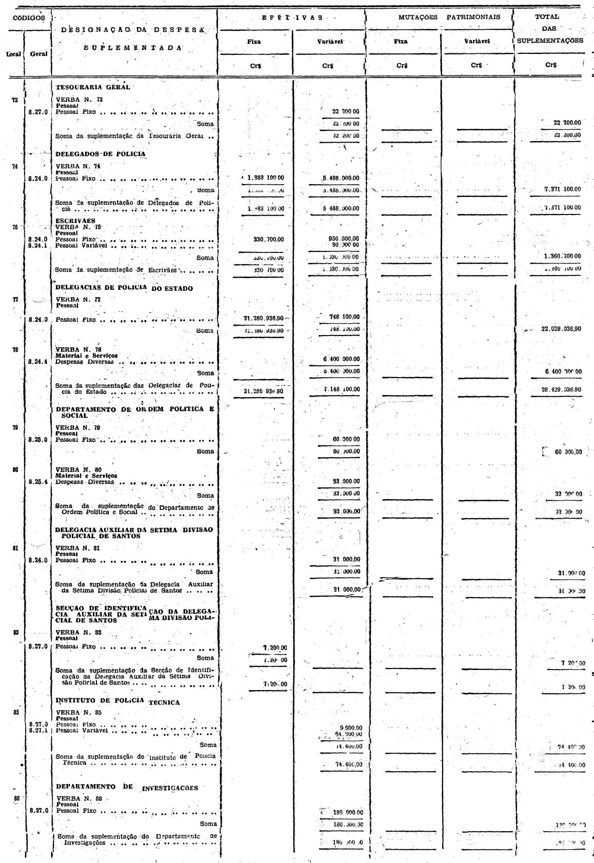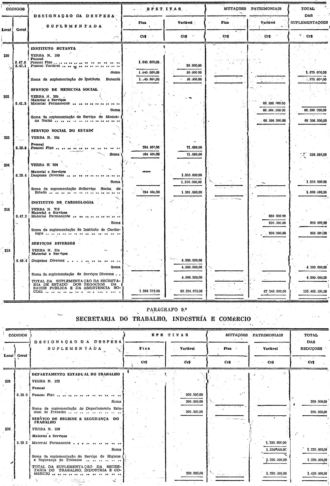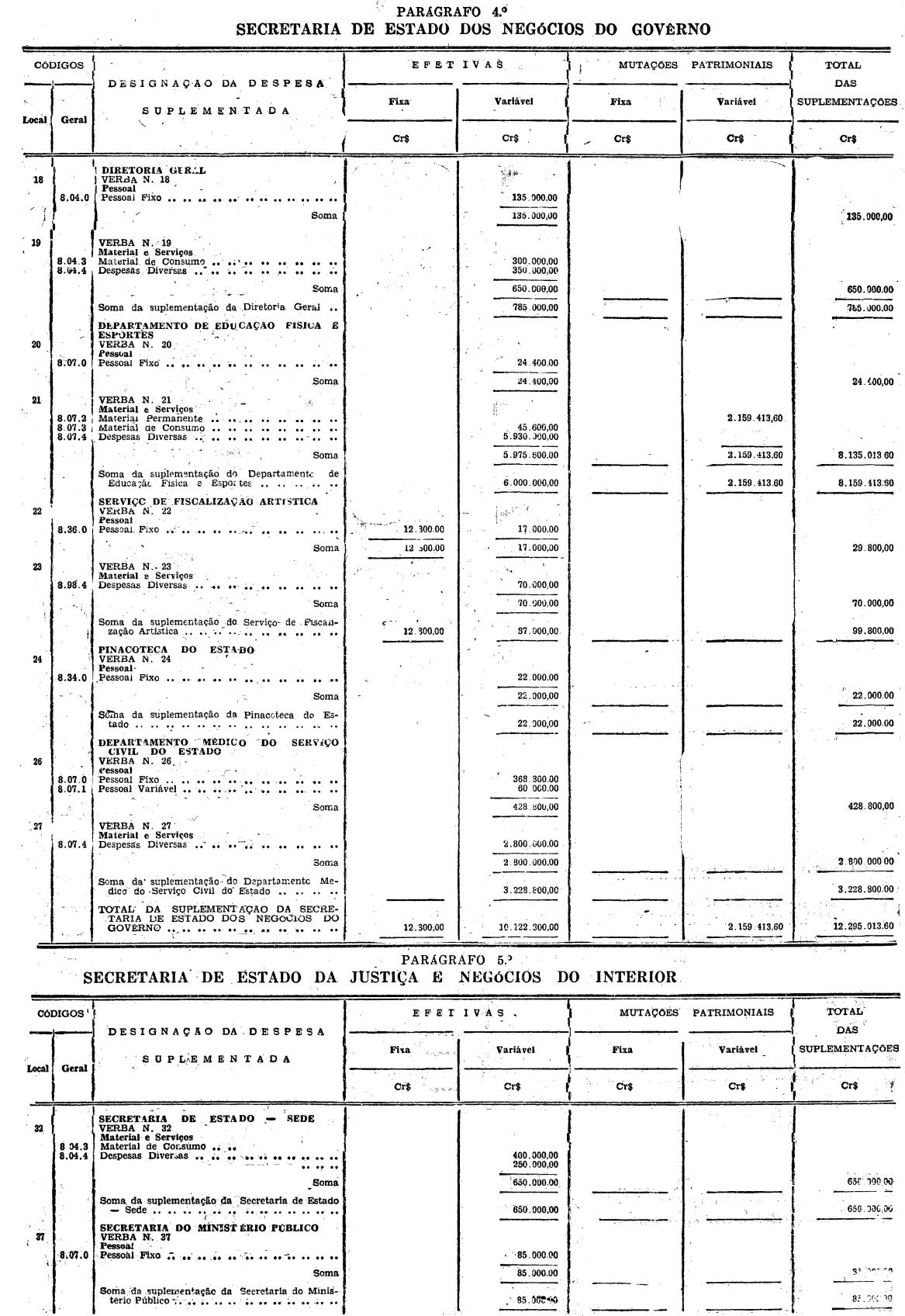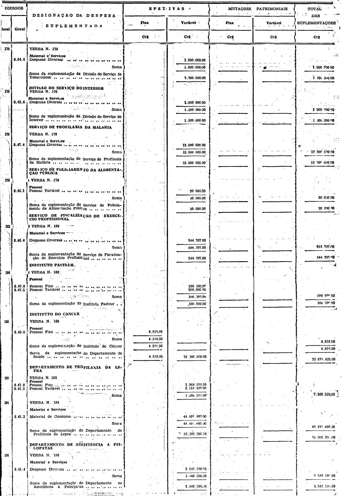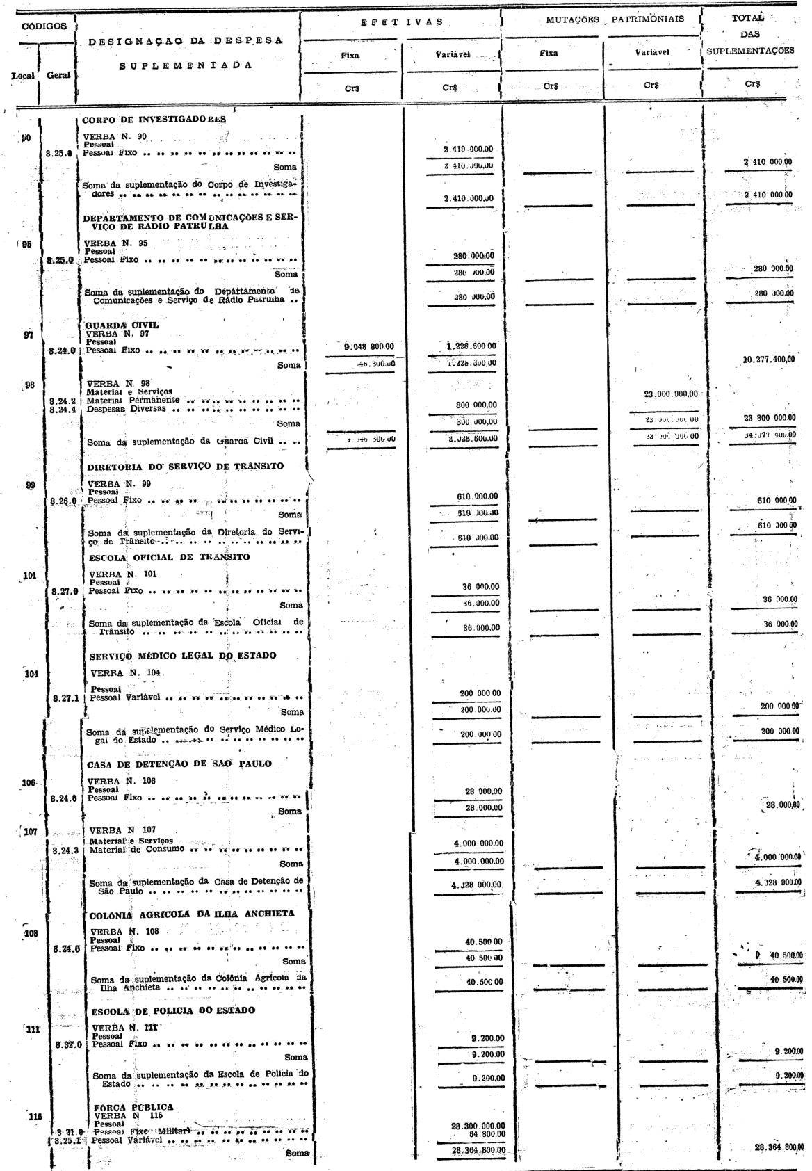 Artigo 1º - Ficam suplementadas, na importância de Cr$ 1.989.727.151,10 (um bilhão, novecentos e oitenta e nove milhões, setecentos e vinte e sete mil, cento e cinqüenta e um cruzeiros e dez centavos), as verbas do orçamento vigente abaixo discriminadas: