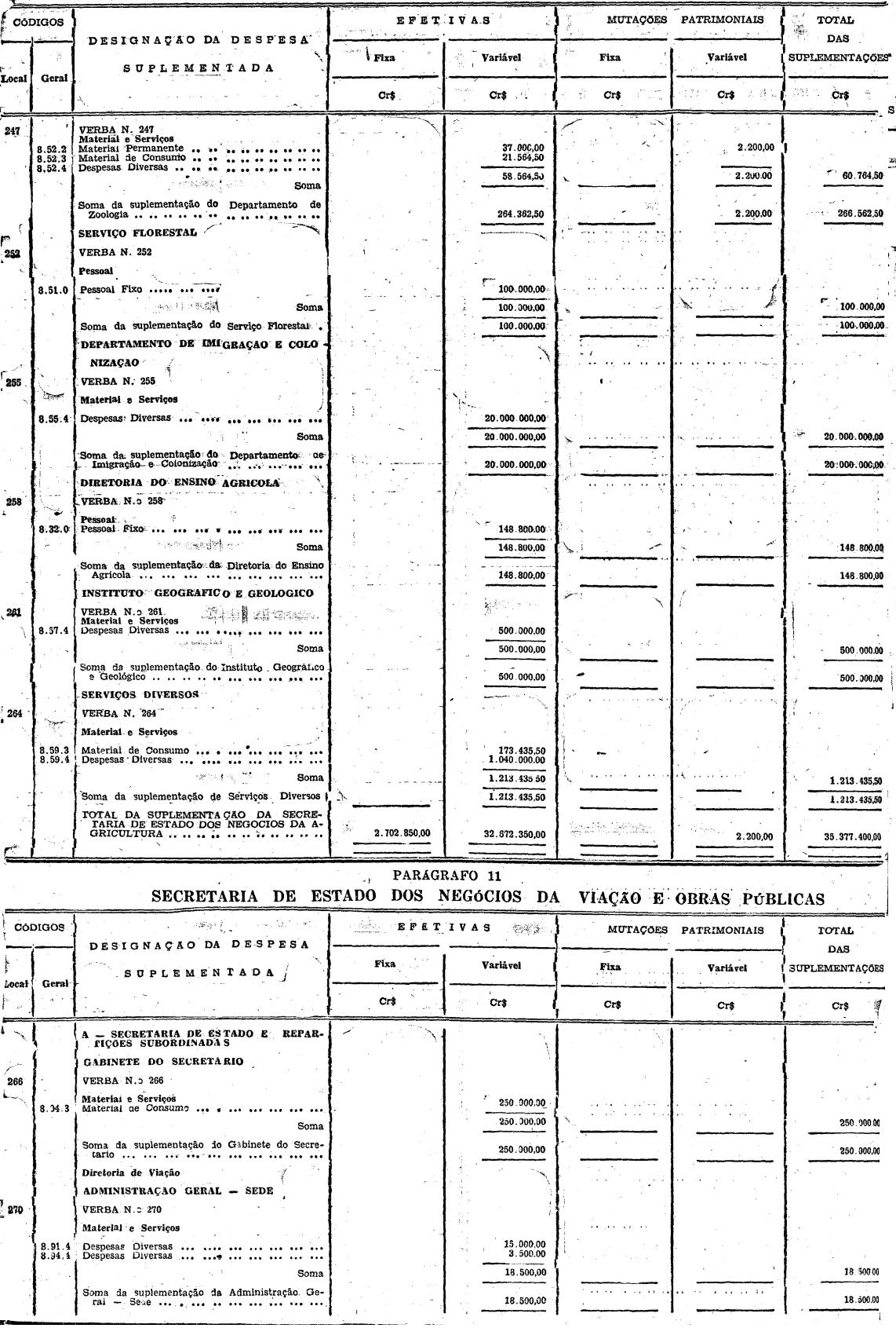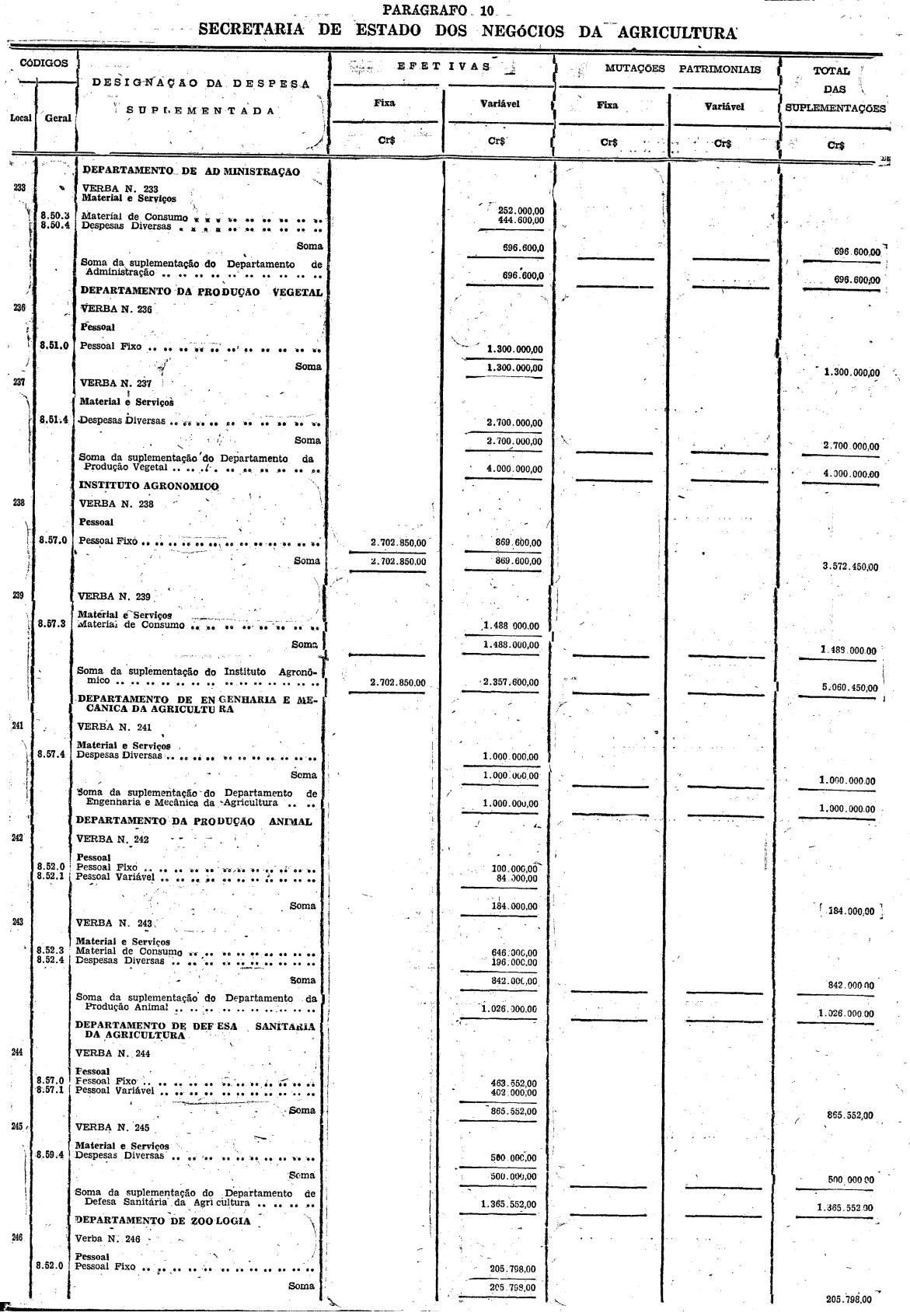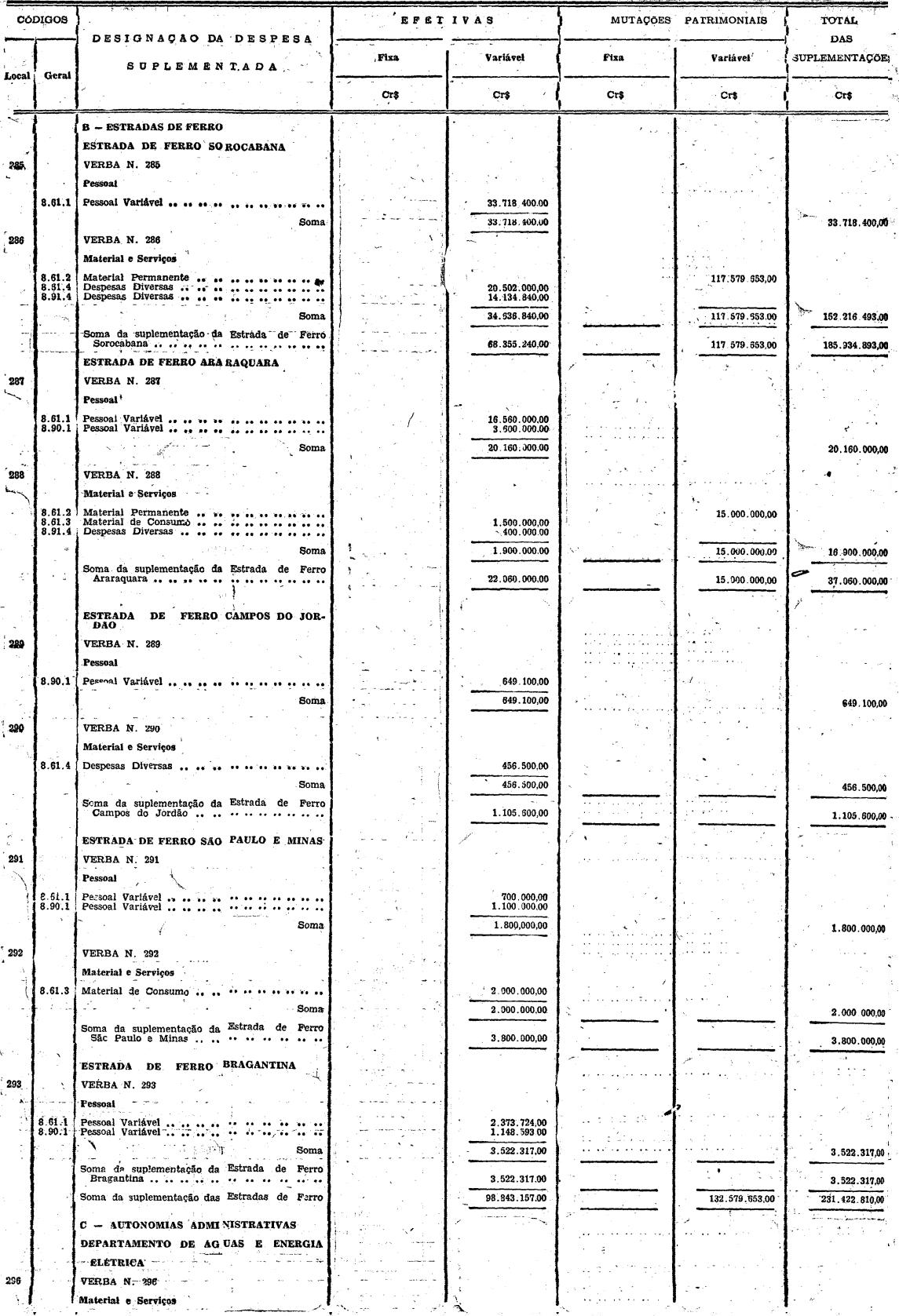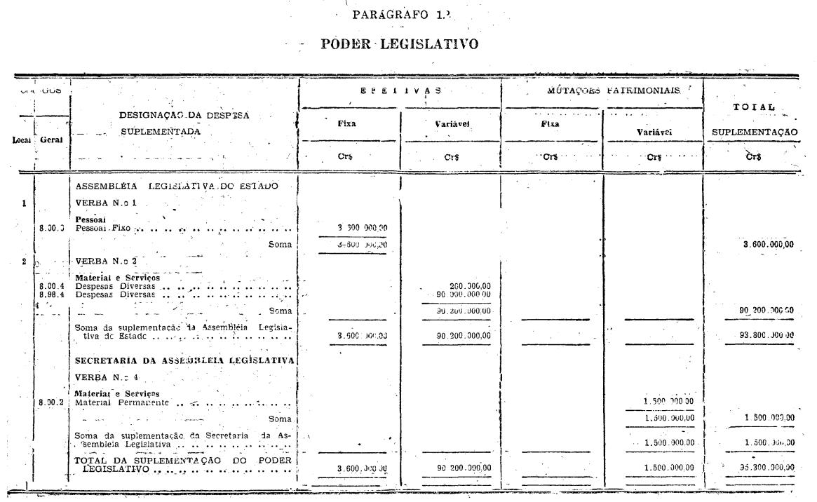 Artigo 1º - Ficam suplementadas, na importância de Cr$ 1.989.727.151,10 (um bilhão, novecentos e oitenta e nove milhões, setecentos e vinte e sete mil, cento e cinqüenta e um cruzeiros e dez centavos), as verbas do orçamento vigente abaixo discriminadas: