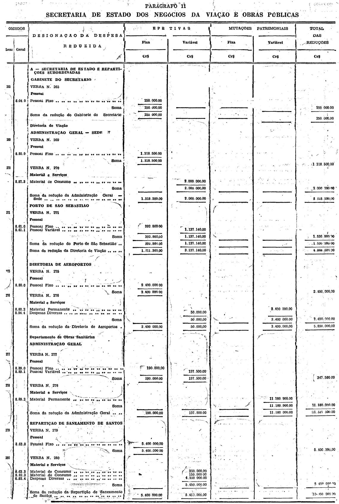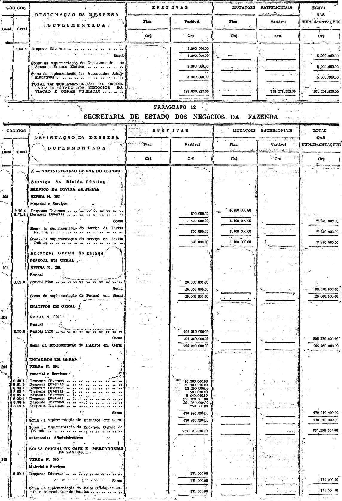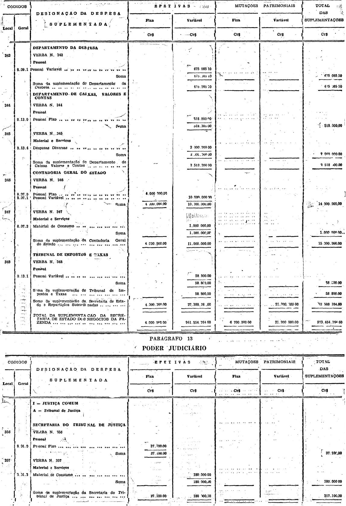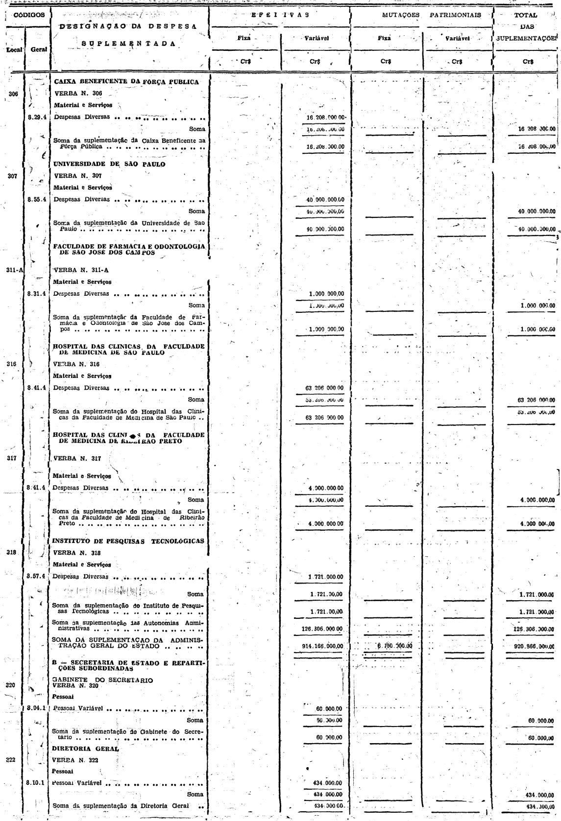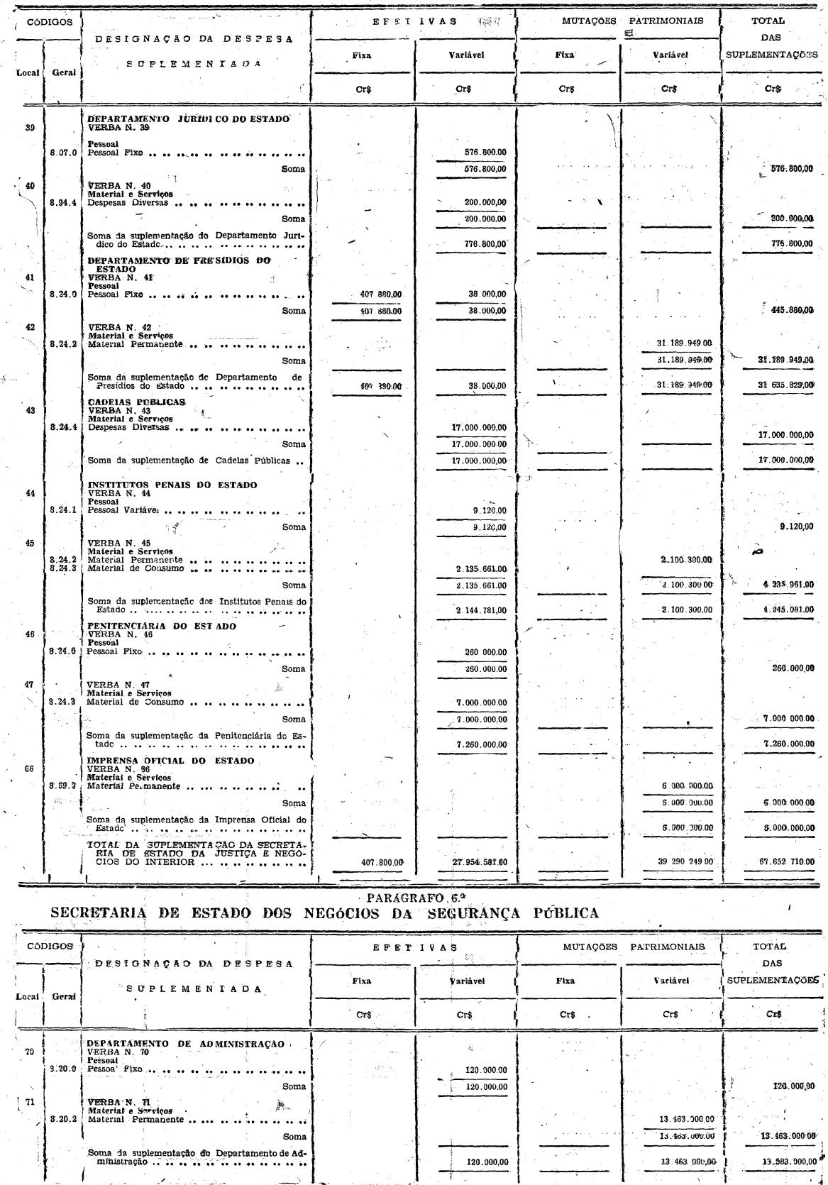 Artigo 1º - Ficam suplementadas, na importância de Cr$ 1.989.727.151,10 (um bilhão, novecentos e oitenta e nove milhões, setecentos e vinte e sete mil, cento e cinqüenta e um cruzeiros e dez centavos), as verbas do orçamento vigente abaixo discriminadas:
