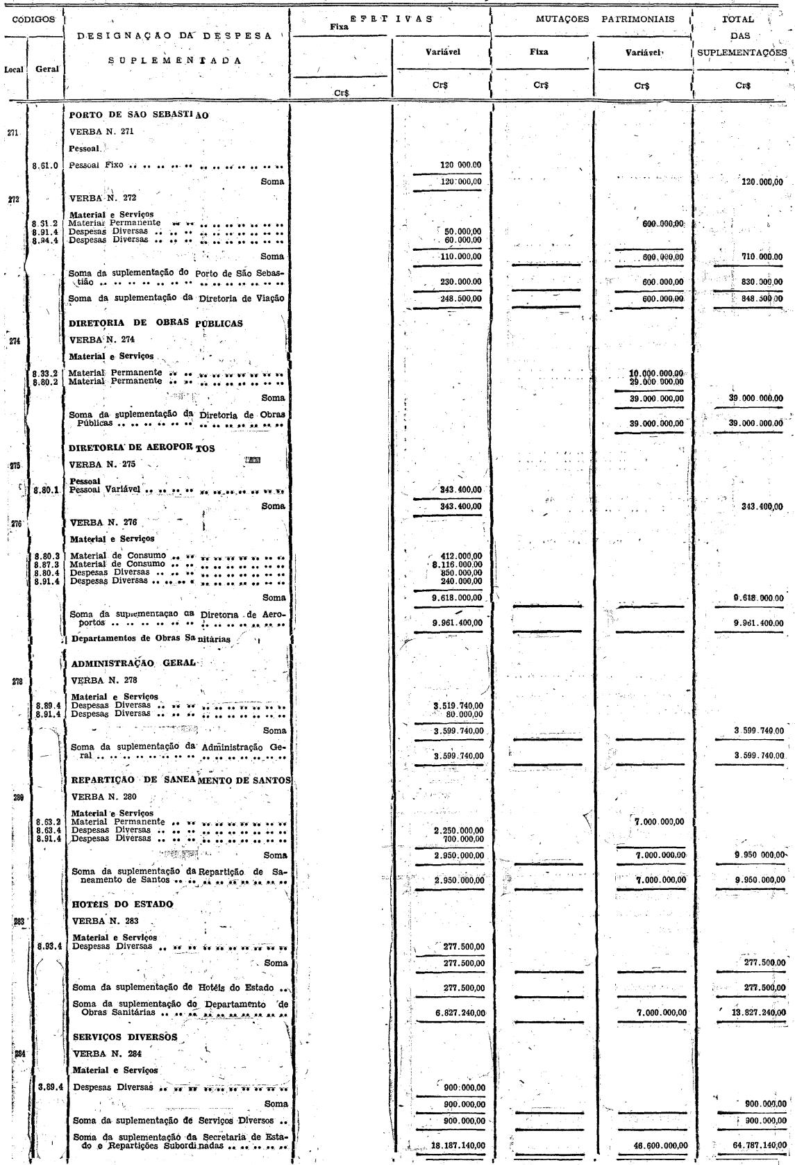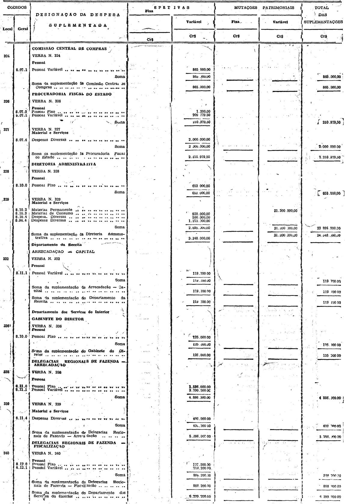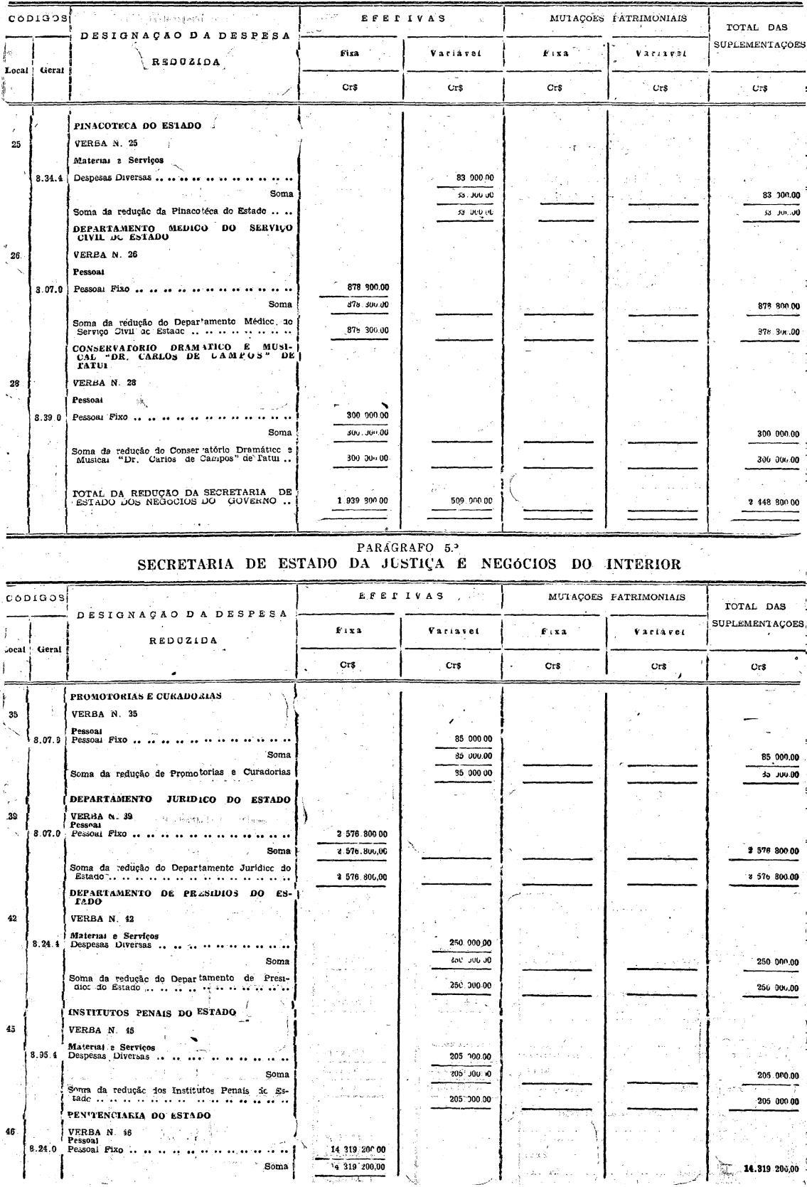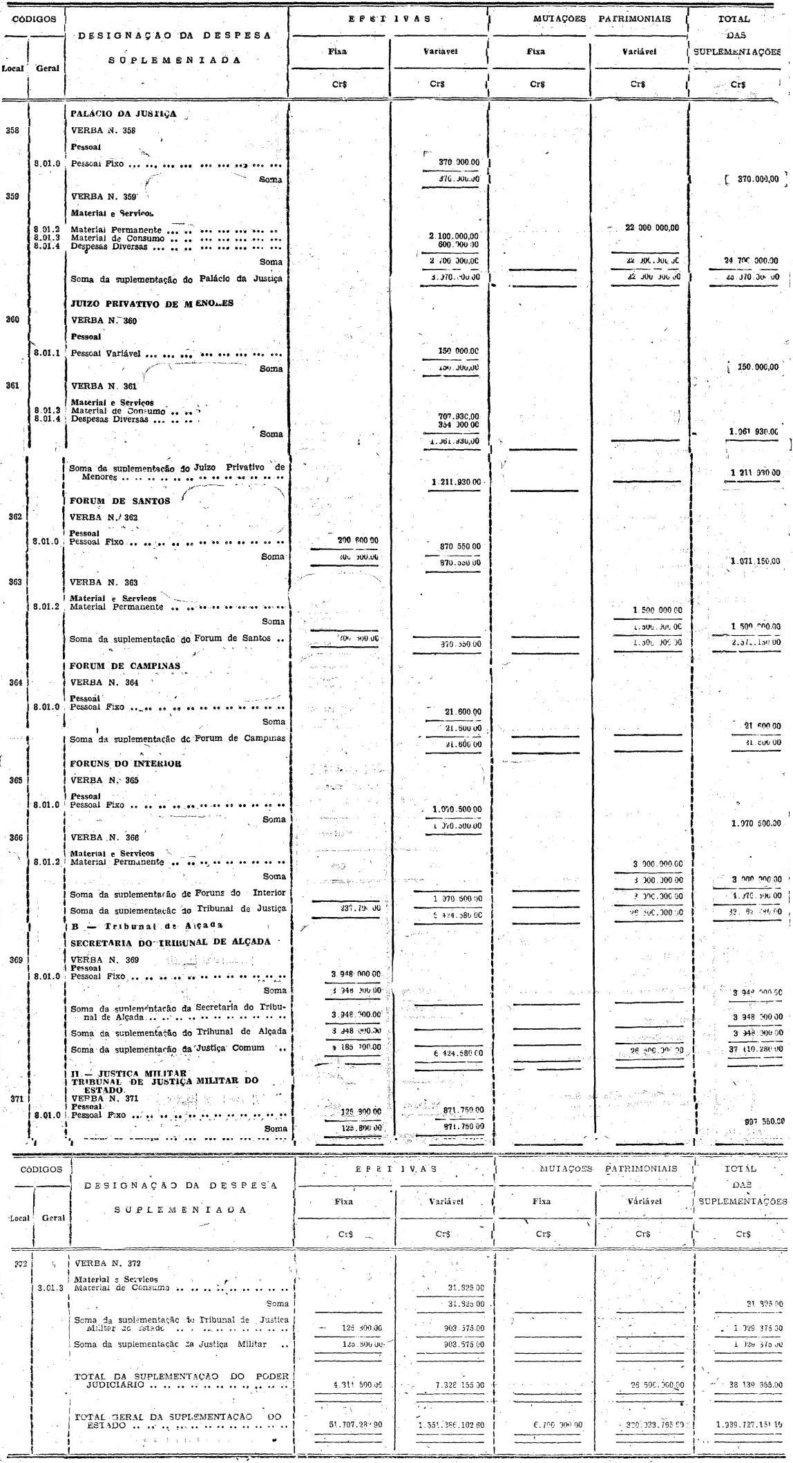 Artigo 1º - Ficam suplementadas, na importância de Cr$ 1.989.727.151,10 (um bilhão, novecentos e oitenta e nove milhões, setecentos e vinte e sete mil, cento e cinqüenta e um cruzeiros e dez centavos), as verbas do orçamento vigente abaixo discriminadas: