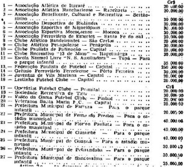 Artigo 1.° - Fica o Poder Executivo autonzado a conceder no corrente exercício, às entidades abaixo mencionadas, auxílios no total de Cr$ 970.000,00 (novencentos e setenta mil cruzeiros):