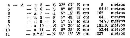 Partindo do ponto comum "A", a 872m (oitocentos e setenta e dois metros) do pontilhão da (C. P.), segue pela cêrca de arame farpado da faixa da férrea numa distância de 483m (quatrocentos e oitenta e três metros) até o ponto 4-A junto à cêrca; daí, segue com rumos e distâncias a saber: