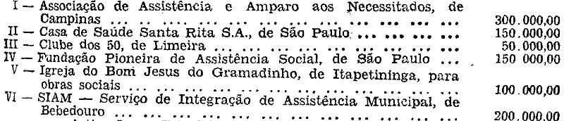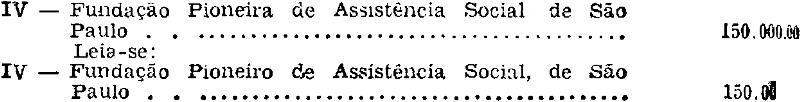 Artigo 1º - Ficam retificados para Sociedade Brasileira de Educação e Assistência, para o Seminário Salvatoriano, de Indianópolis, de São Paulo, e "Nosso Clube", Sociedade Esportiva, Recreativa e Cultural de Ibirá, respectivamente, os nomes das entidades beneficiadas com os auxílios constantes do n. 11 do item XVII da Relação n. 27 do Artigo 1º da Lei n. 6.027, de 31 de dezembro de 1960, e do n. do item II da Relação n. 11 do Artigo 1º da Lei n. 6.708, de 4 de janeiro de 1962.