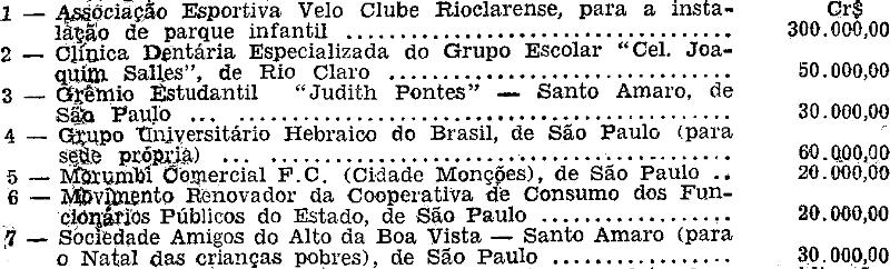 Artigo 2º - Ficam retificados para Associação Beneficente Hospital N.S. da Piedade, de Lençóis Paulista, Sociedade de Beneficência Santa Cruz, de São Paulo, Hospital e Maternidade Modêlo Tamandaré S/A, de São Paulo, Irmandade Nossa Senhora do Rosário dos "Homens Prêtos", de São Paulo, e Grêmio Esportivo XI Mosqueteiros - Barra Funda, de São Paulo, respectivamente os nomes das entidades beneficiadas com os auxílios constantes do n. 4 do item X da Relação n. 2, do n. 18 do item XXIX da Relação n. 31, do n. 3 do item IX da Relação n. 63, do n. 20 do item V da Relação n. 64 e do n. 21 do item X da Relação n. 81, todas do Artigo 1º da Lei n. 6.708, de 4 de janeiro de 1962.