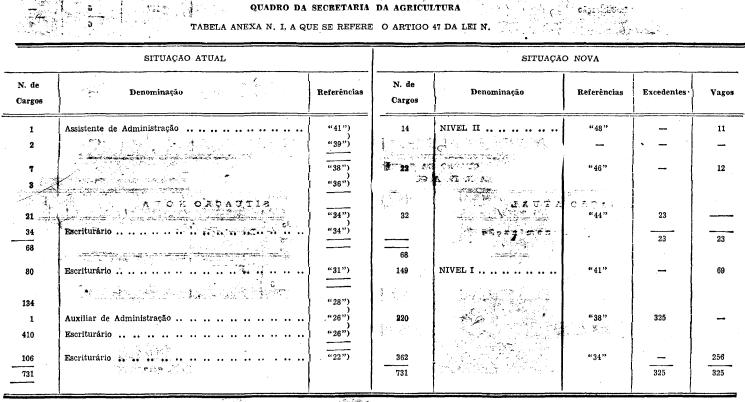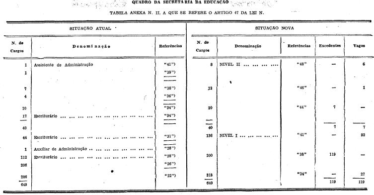 Artigo 48 - Passam a integrar a carreira de que trata o artigo anterior os atuais cargos das carreiras de Assistente de Administração e de Escriturário, da Tabela III, da Parte Permanente, dos Quadros das Secretarias de Estado, e os da carreira de Auxiliar de Administração, da Tabela II, da Parte Suplementar, dos mesmos Quadros, na seguinte conformidade: